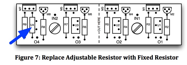 Install the CERMET pots (U4-U1), followed by the grid-stopper resistors (R9-R2). If fixed current-adjust resistors are used, replace the pot with a fixed resistor. For example, Figure 7 shows the leftmost adjustable resistor U4 replaced by a fixed resistor. The other three CCSs have similar pads for fixed resistors.