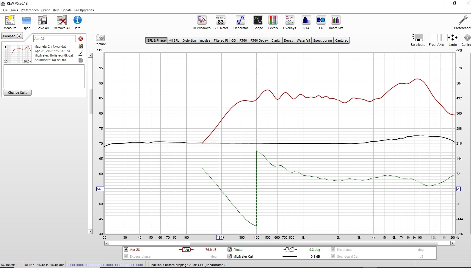 After some work on the dspNexus 2x8 crossover for the Magnetar II planar driver we now have this frequency and phase response with a quasi-anechoic farfield measurement. Looks pretty good to me.