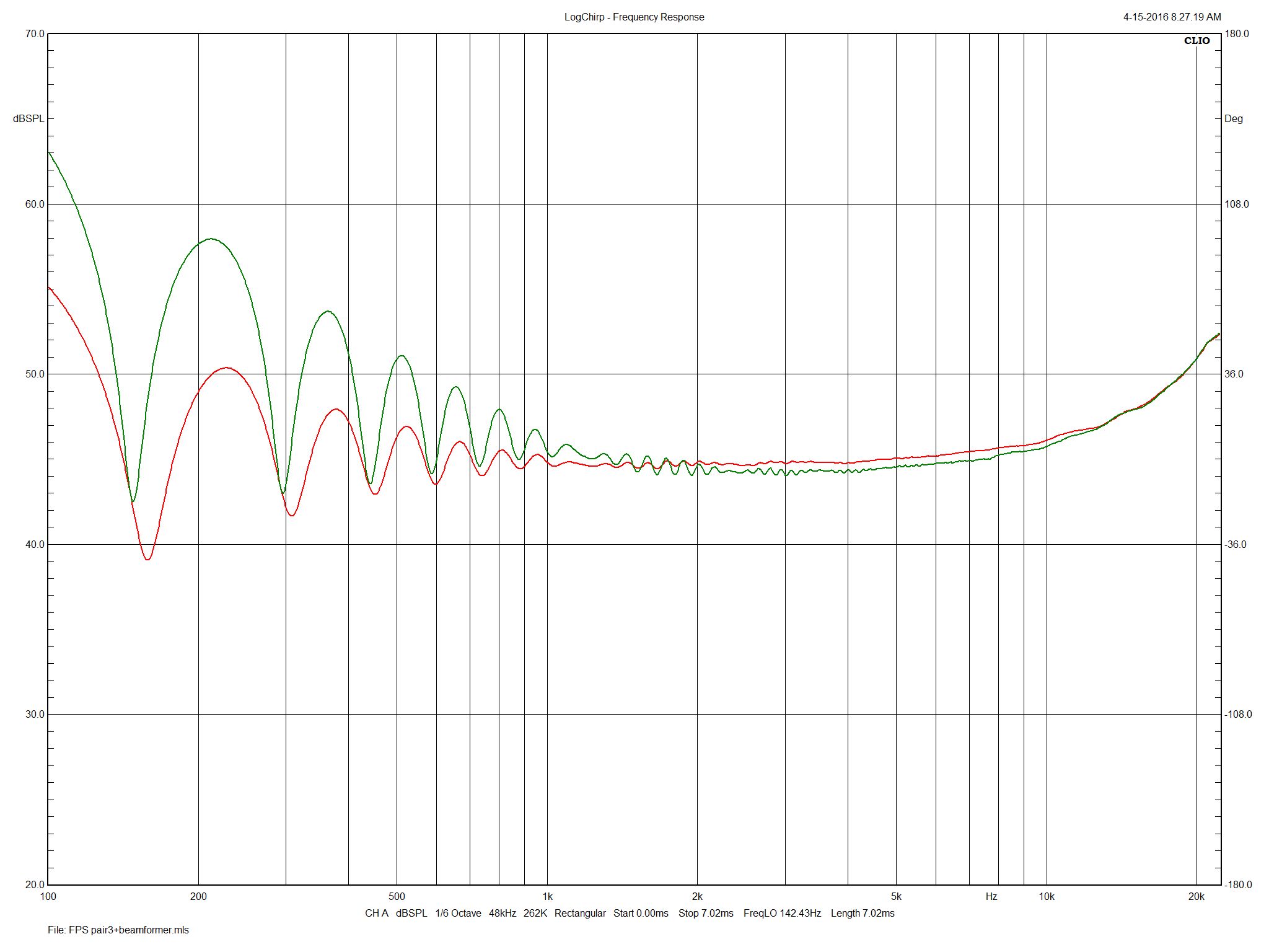 Here is a comparison of the FPS line array with the beamformer. The red plot is the beamformer off and the green plot is with the beamformer on. About 5dB of gain at the low end with the beamformer running. I did not select FPS drivers for sensitivity matching, so that might make it a little better.
