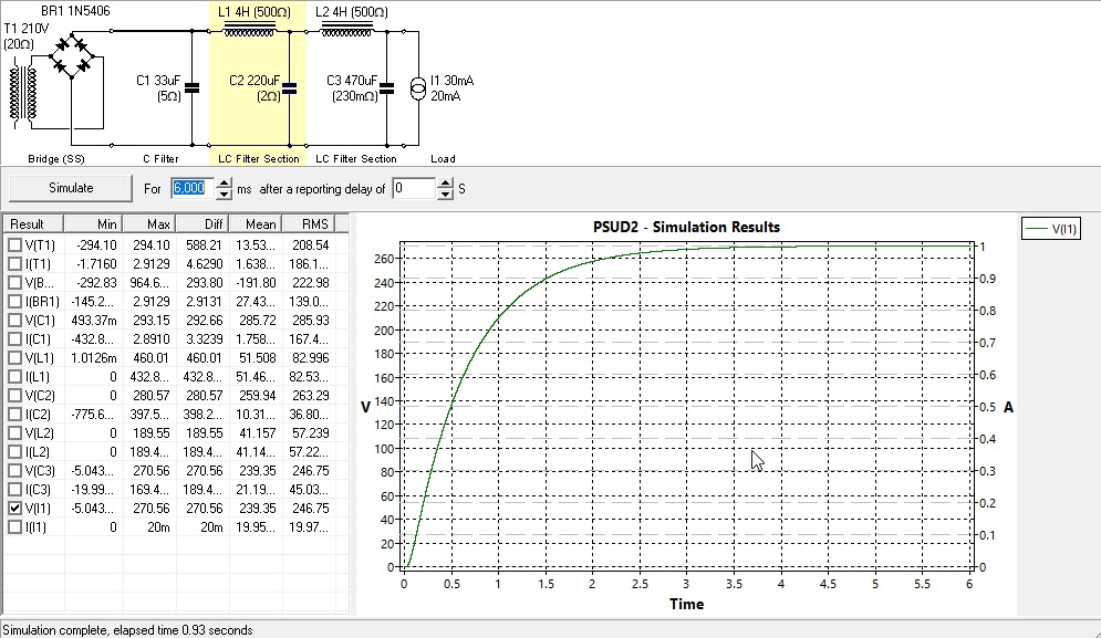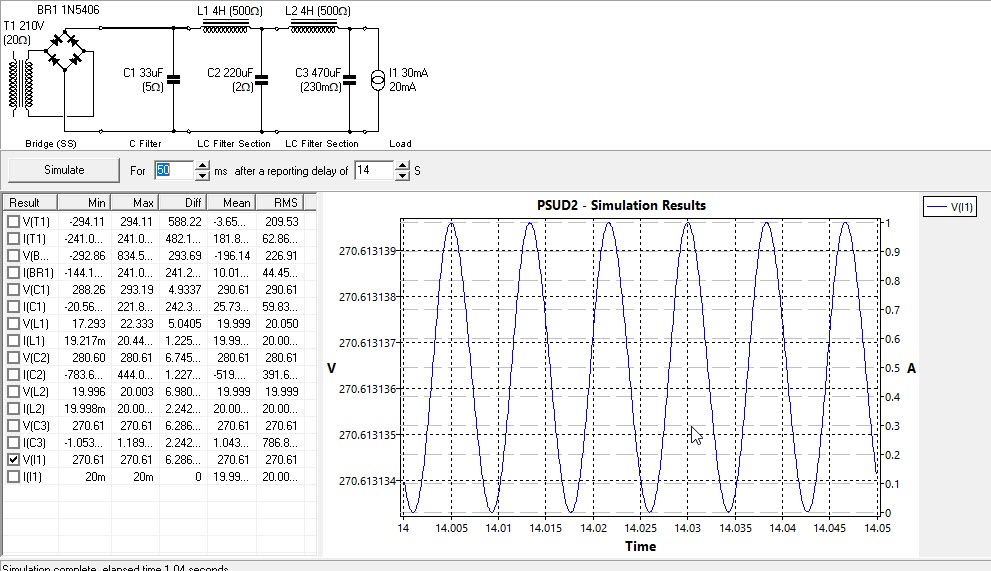 Also use the rectifiers you intend on using where possible, since it will model the drop across them as well as give you an indication of whether you are exceeding their current capability or PIV. Also, I find that using a 1000mS window is too wide and you cannot see what is happening for all the 120Hz ripple, I like to use a 200mS window. The only case I would use a longer window is if I wanted to see turn on behavior to see if the voltage spikes up excessively and how long does it take for the power supply to charge up.