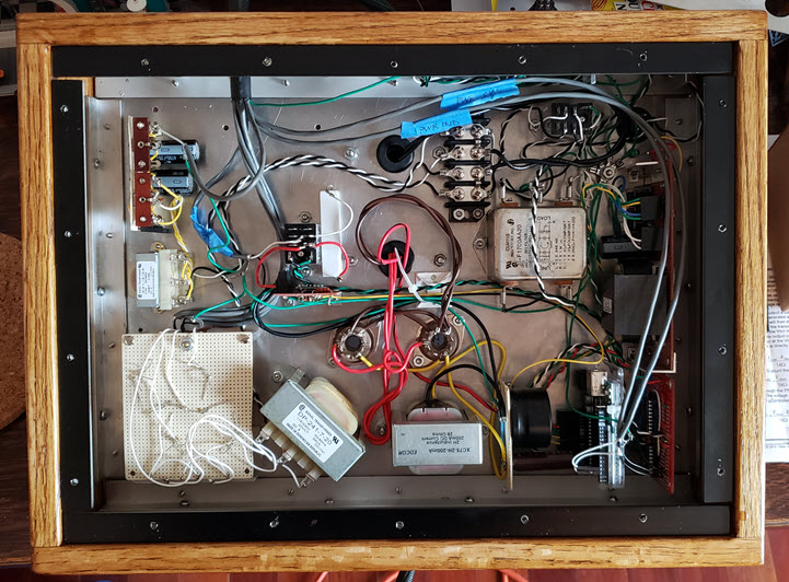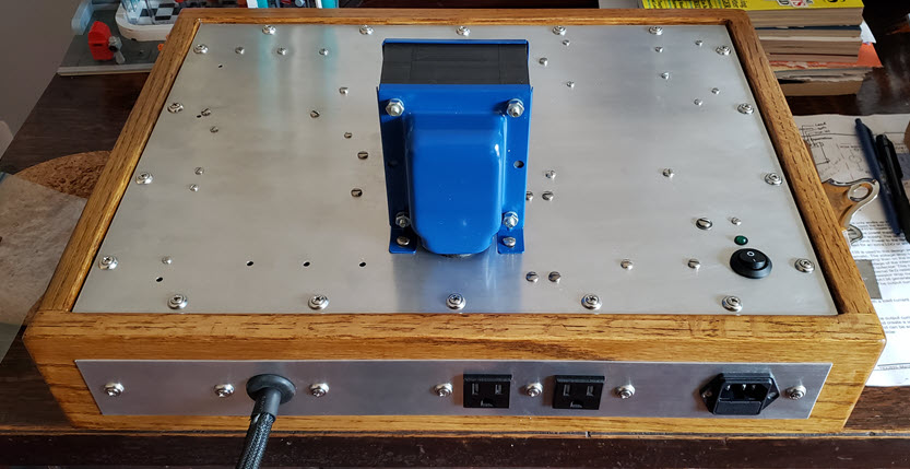 It's funny how much time a project can consume. I now have a pair of red-oak boxes to house both the phono pre-amp and its power supply. Both have aluminum top panels and perforated-steel bottom panels that mount to the boxes using tapped angle aluminum. The power supply attaches to the pre-amp chassis using a six-foot umbilical made up of a set of shielded twisted-pair cables ending with a military-quality 19-pin Bendix twist connector. A power switch enables the supply, which then waits for a signal from the pre-amp to energize the pre-amp circuits. The power supply is finally together so I can move on to the pre-amp.
