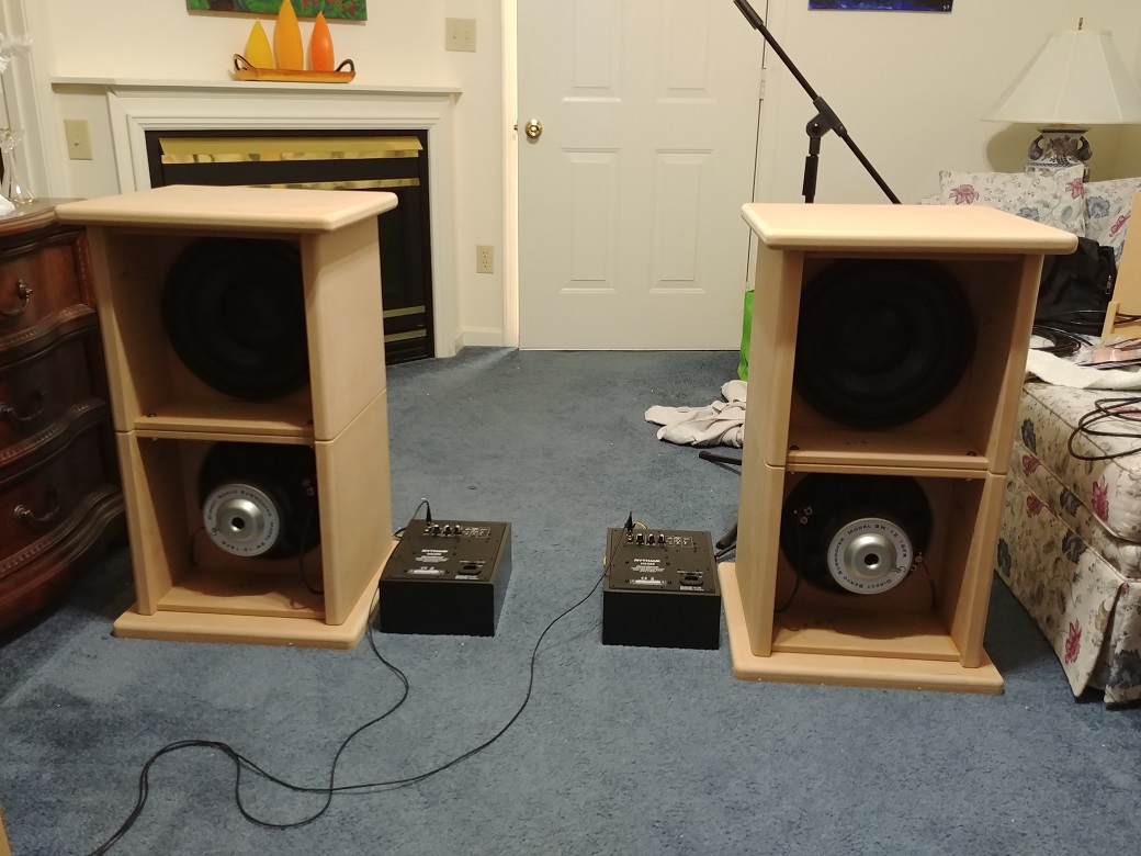 The servo amps are up and running with subs and the digital crossover. Pink noise sounds very smooth and goes low. No room boom, just bass.