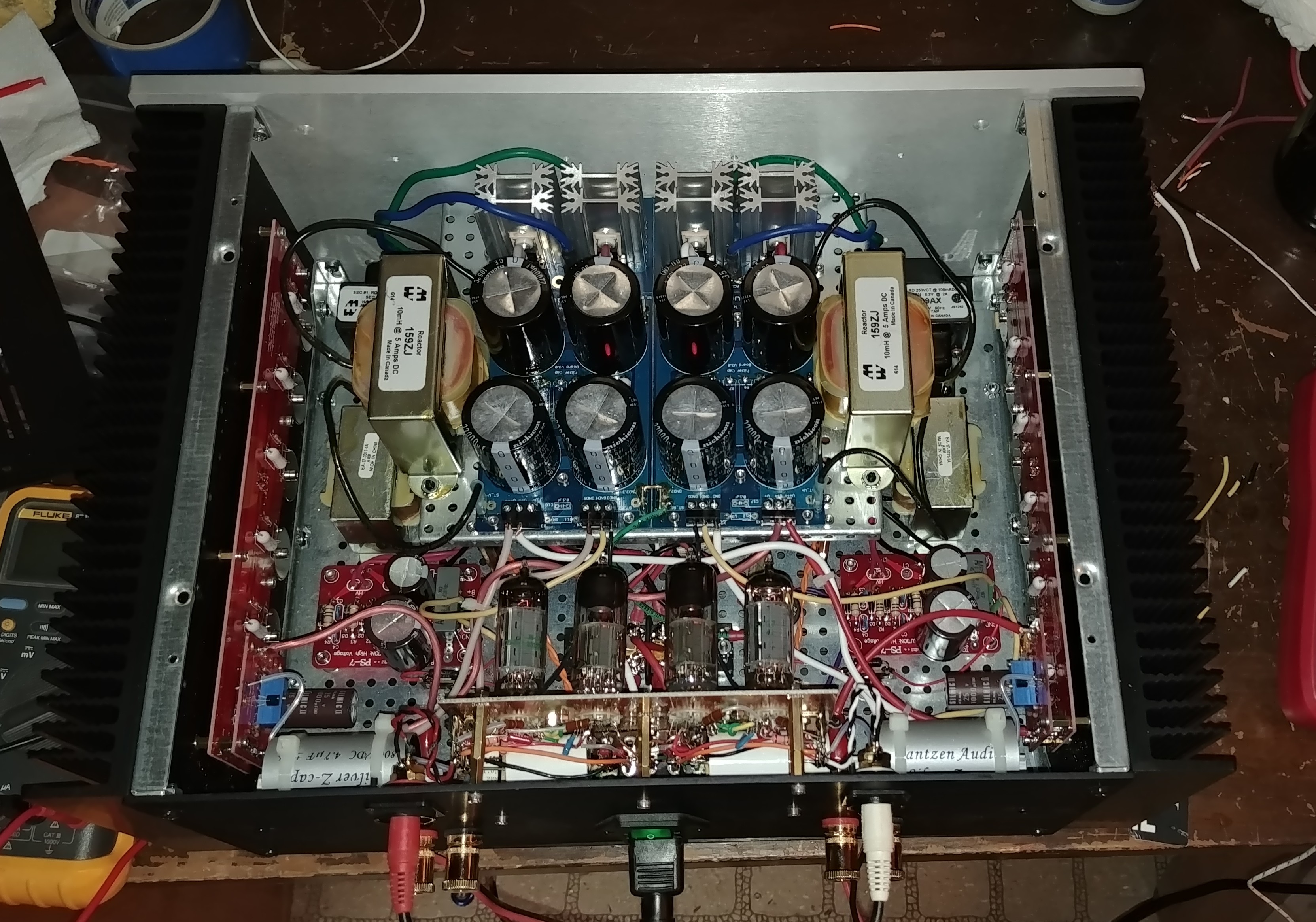 Just finished assembling a tube/MOSFET hybrid amp based on John Broskie & Bob Prangnell "Moskido" concept, using a 6CG7 gain stage, a 6N6P White cathode follower, cap coupled into a Pass Burning Amp complimentary output MOSFET source follower stage. I had originally considered an octal based tube front end (6SN7 + 6BX7), but did not have space or heater current for the 6BX7. This was a rebuild of my Pass First Watt F-4 clone (same chassis and LV power supply), but with new output/bias boards, mono HV B+ and heater supplies for each driver stage channel, and a point-to-point wired Aikido board.