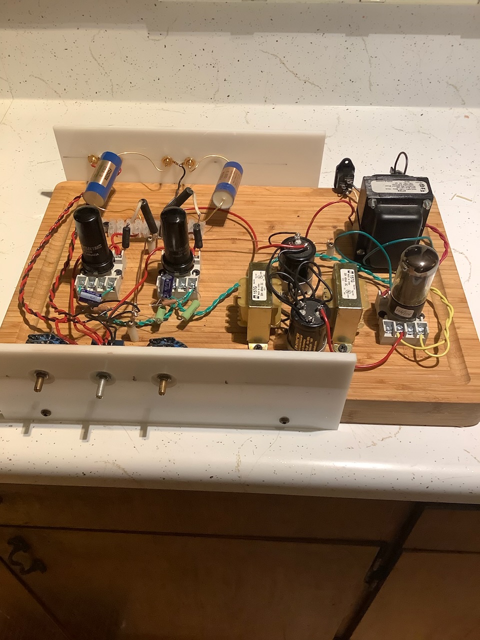 Reroute that final leg of the B+ line, it's millimeters away from the ground bus and the lead on one of the output caps. Fly it in from the top.....