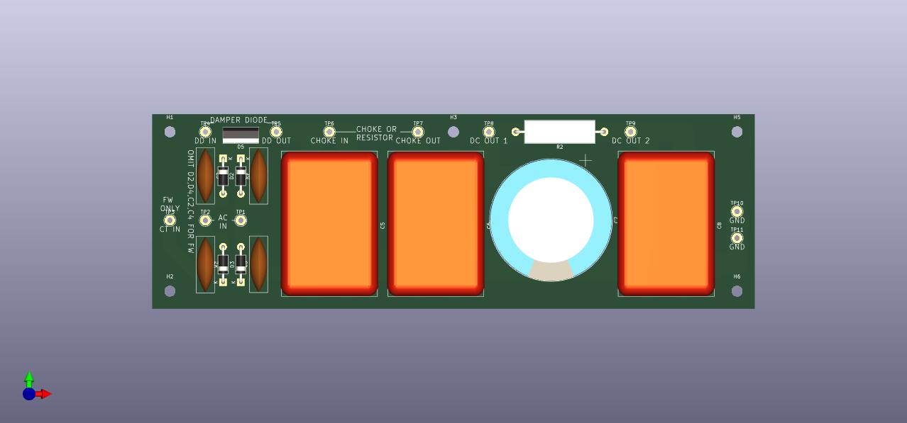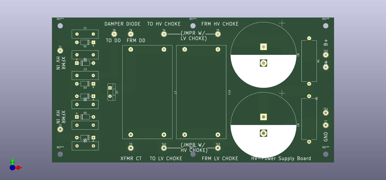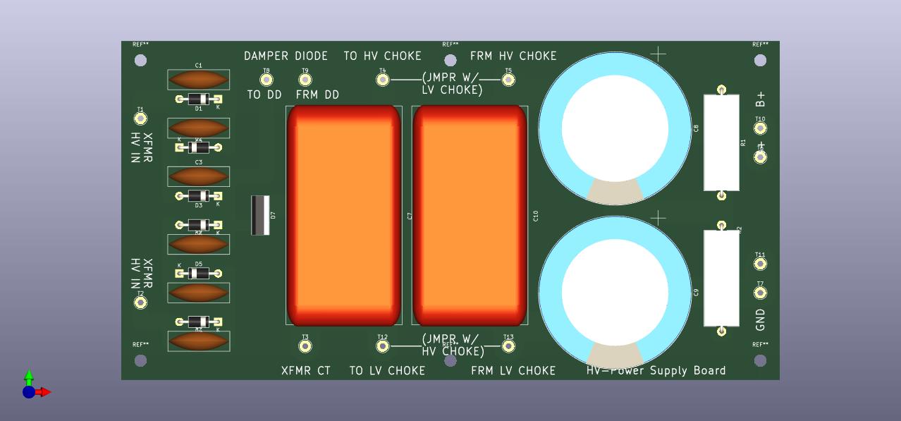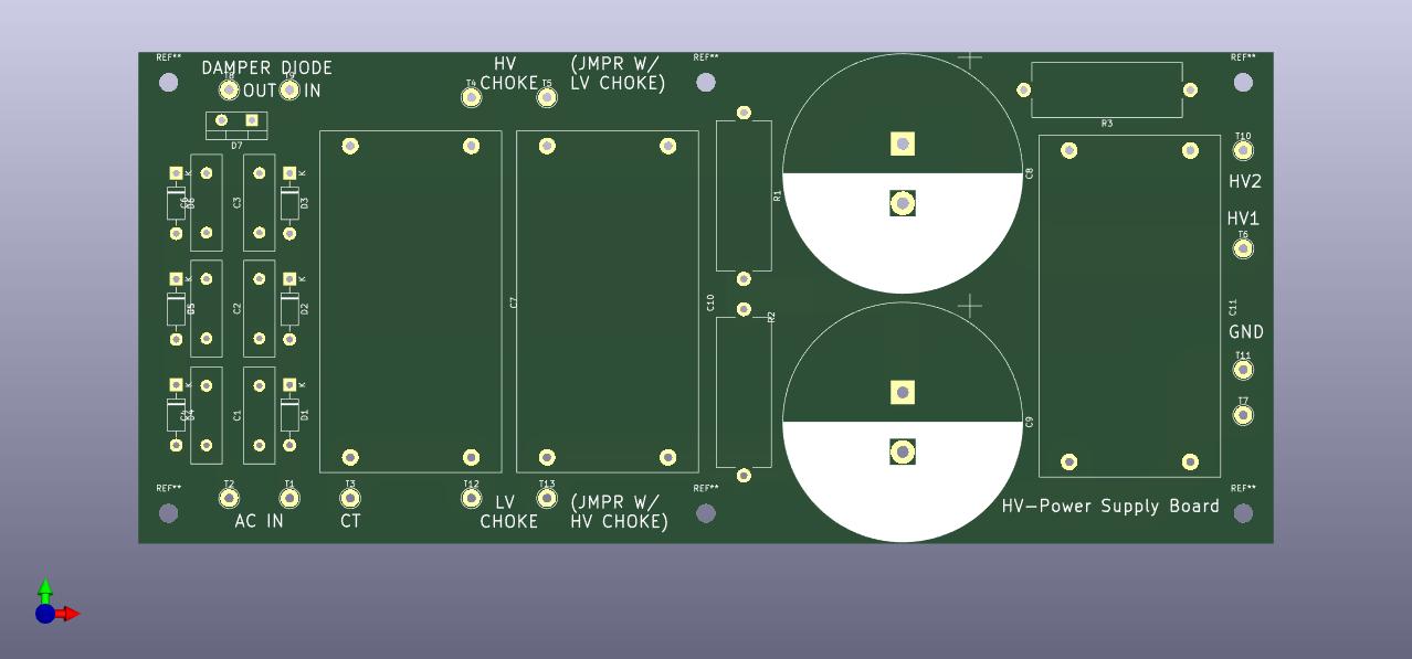 The boards are still being refined. I caught an error in the direction of rectifier diodes in the bridge on the Driver Board (quickly corrected), but based on some feedback from Charlie, I reworked the HV Power Supply board rearranging the rectifier and adding another filter stage. This will work better as a generic power supply board, basically a higher voltage equivalent to the Driver Power Supply board which is similarly a CLCRC arrangement.