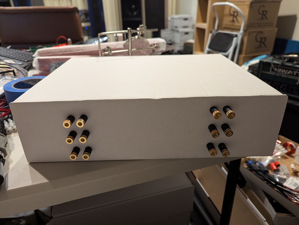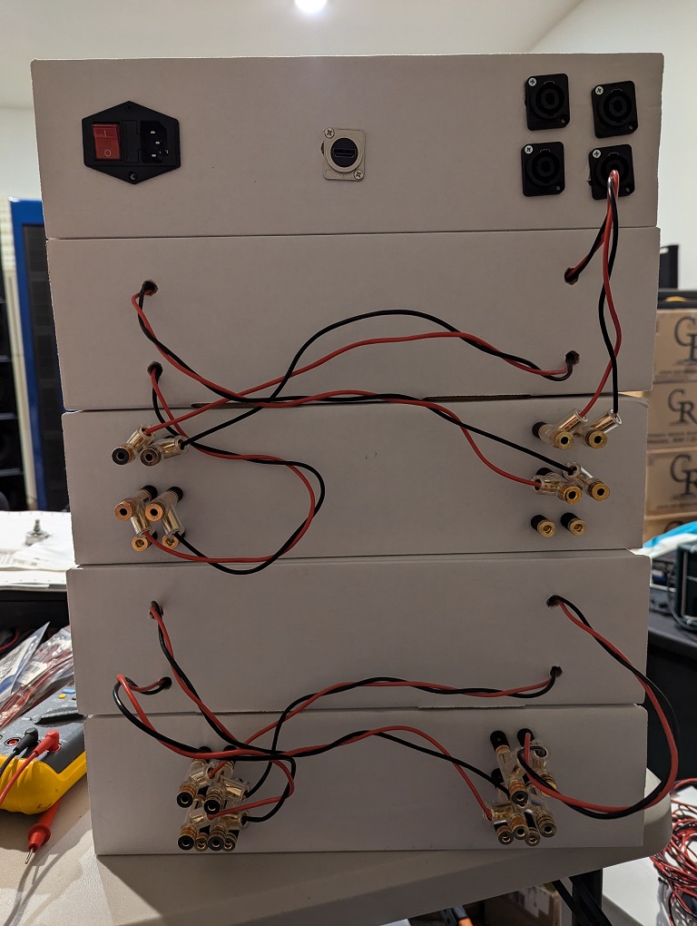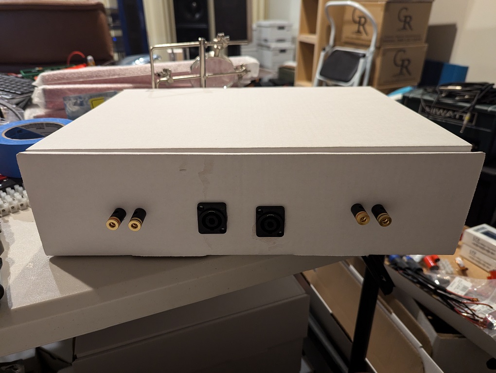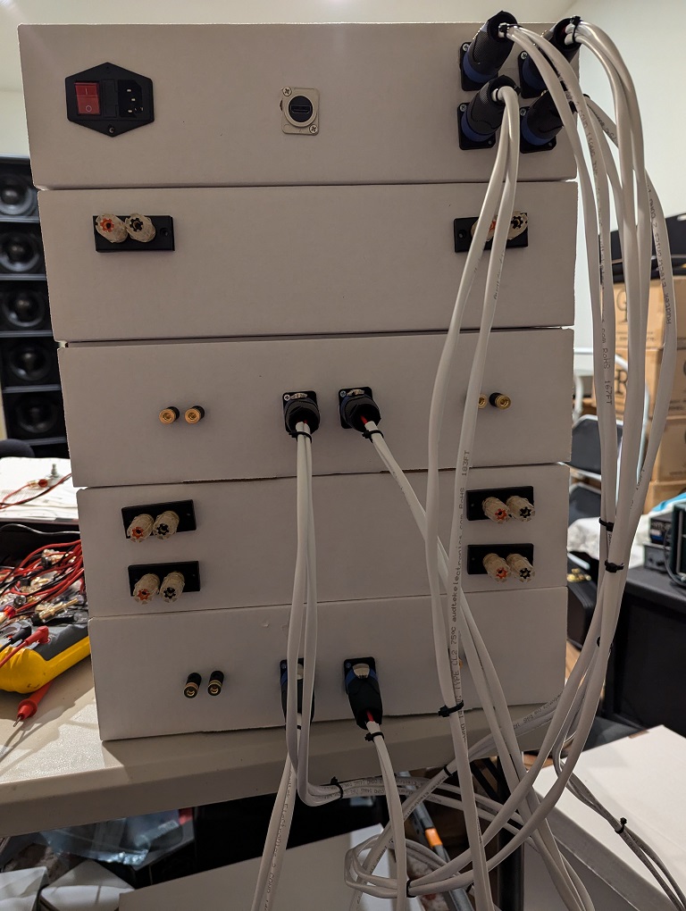 The first ABC Switch relay box #1 prototype is done. The Neutrik connectors are relay switching signals on the front with the outputs to the speaker drivers.