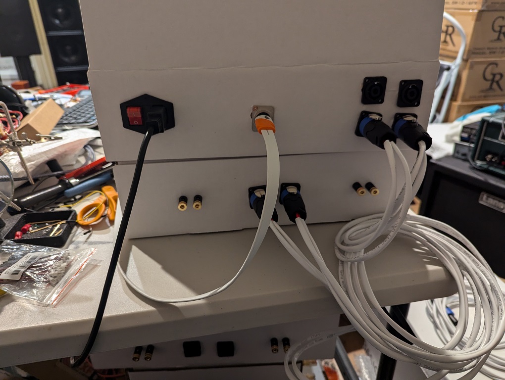Now for system connection and listening trials. Need to level match the 3 crossovers. Cable lengths for each channel are 8ft of Belden 1309A 14awg speaker cable without the PVC jacket.