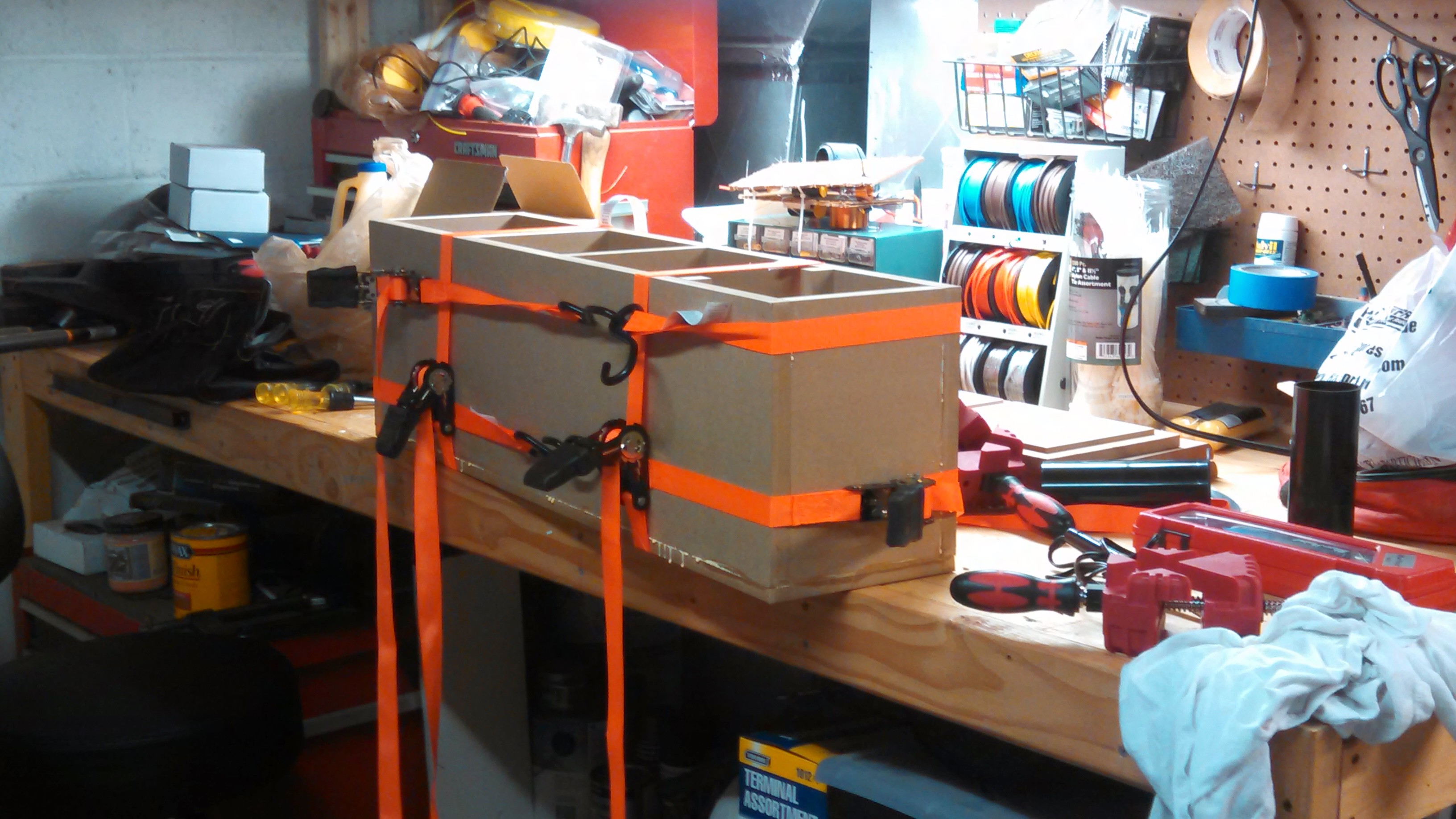 Got the cabs glued together per Eric's instructions. No fasteners of any kind were used as all cuts were CNC and dado so the fit was snug. Clamping was a learning experience. I had bought a bunch of clamps that none worked perfectly and then decided ratchet straps and cushions worked much better.