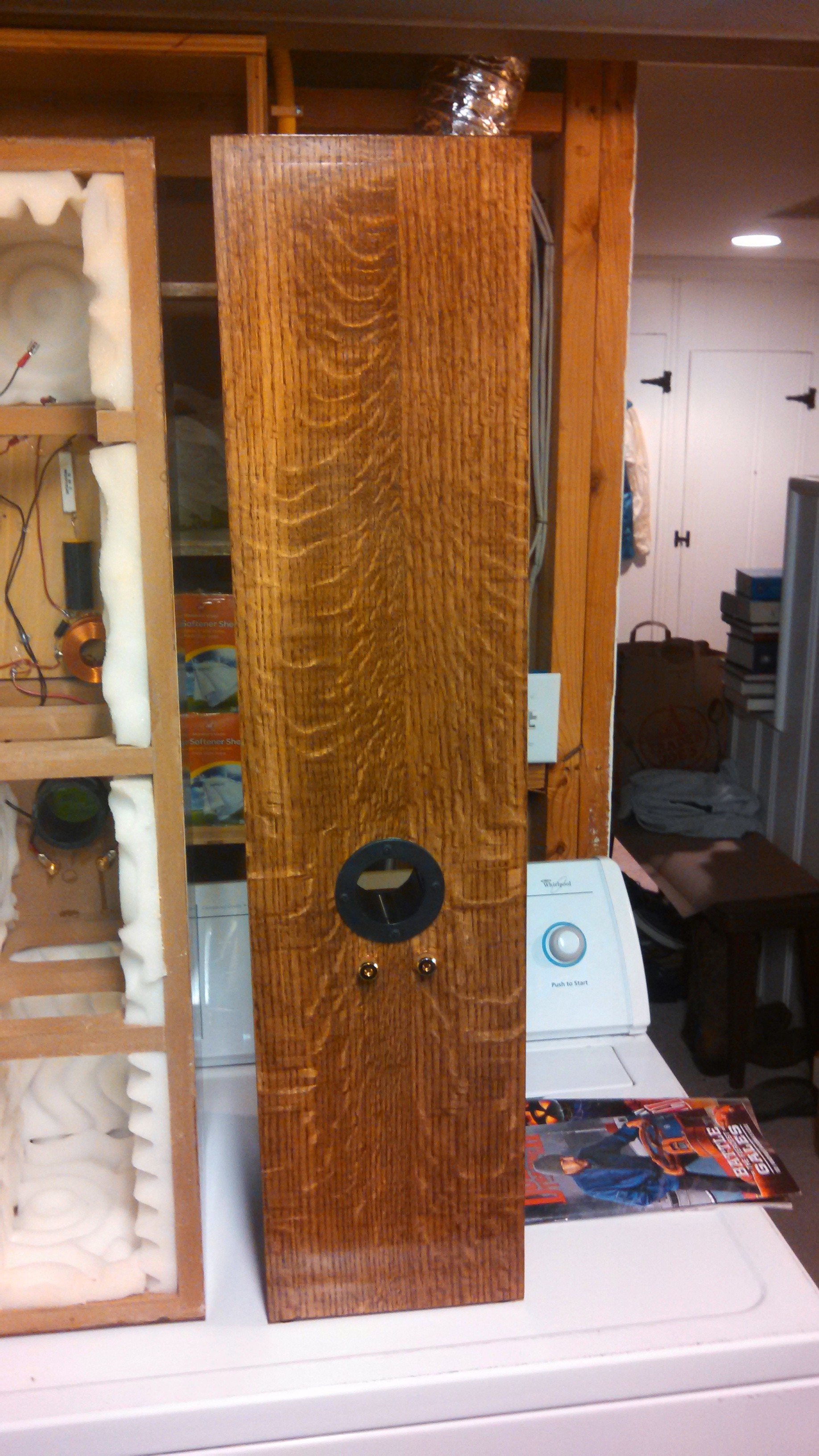Decided on special walnut to get me closer to the color I was looking for. Couple of coats of stain, and then went on to poly. This is where I would do things differently next time. I had some helmsman left over from other projects and decided to use it. It has a good UV protectant in it so I figured no problem. Well spar urethane is a pain in the @#$, and caused a lot of headaches. Ended up with 2 undiluted coats- 5 thinned coats, and then wetsanded with 800. 1000. 1500, cut and buff on top of that. They are as slick as an antique crisscraft now - still see some imperfections and some buildup near edges. I did not realize Helmsman is designed to remain softer- and that made things complicated. All in all though- and from the normal listening distance- I think they look awesome.