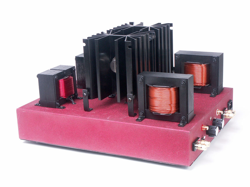 I'm including three photos, the 2SK77s in comparison to a TO3 and TO220 transistor to give you an indication of the size of the beast, The underside of the amp showing the circuit board, and the completed amp. SInce this is a "retro" project I decided to paint it with a metal flake glitter paint called "cherry bomb" for effect.