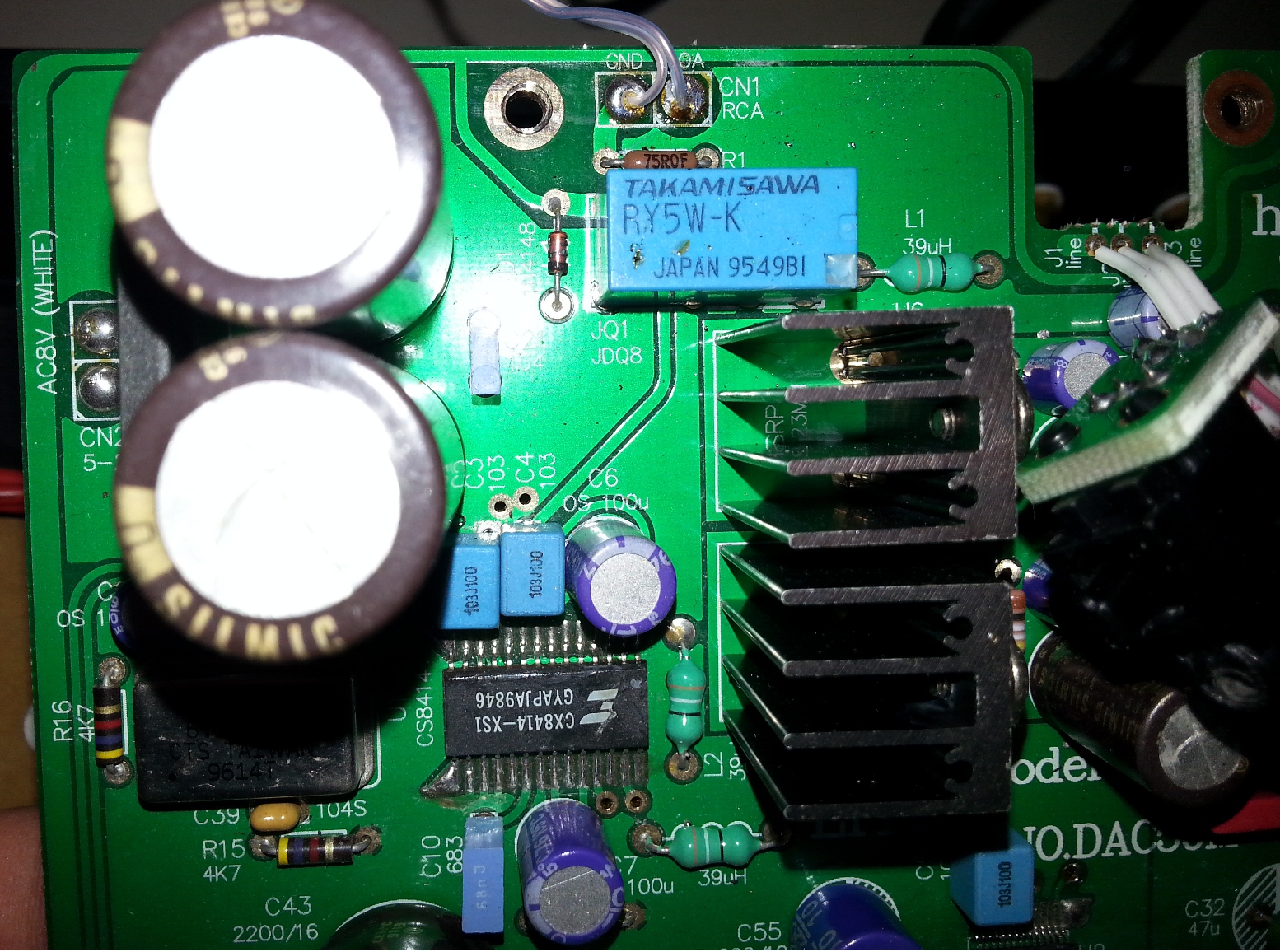 Pictures are attached from when I replaced the Toslink input with a transformer, per Crystal's data sheet on the chip, to allow balanced input. Attaching both schematics. Will have to do multiple posts due to file attachment limits.