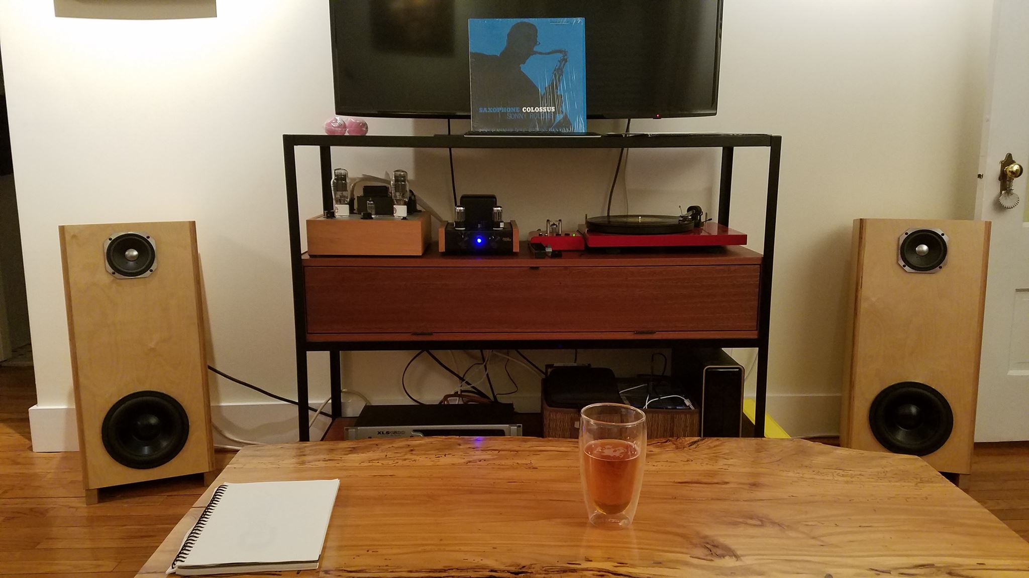 My listening room is only about 10 feet deep, so the speakers have to be very close to the front wall. They also can't be super wide. I recently tried some old Zenith 12" drivers in an OB that was 36" high x 16" wide with 12" wings on either side. The WAF was rather low on those, and the sound wasn't that great, so back to the basement they went. I attached a pic of my current scene for perspective.