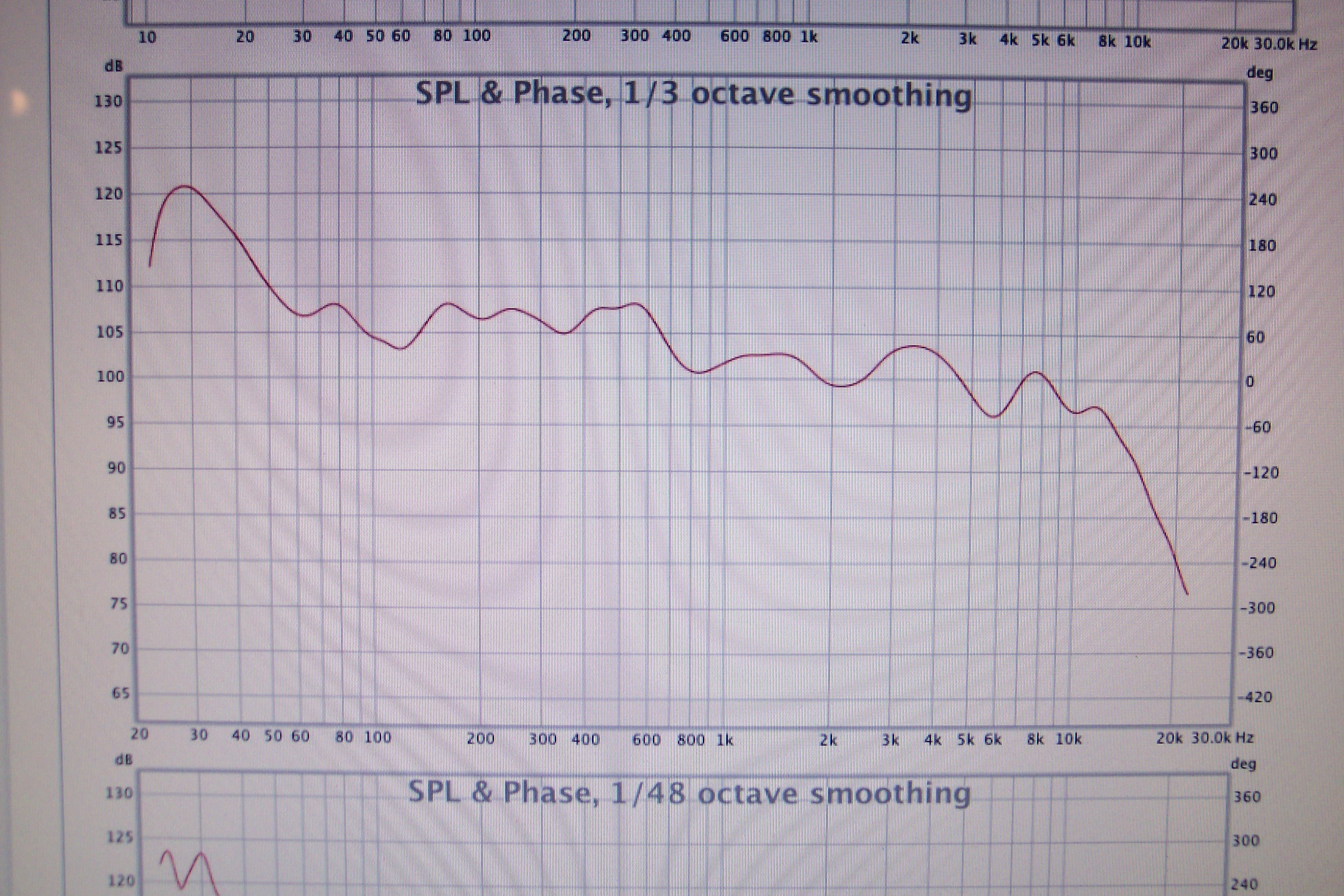 Looking at the smoothed frequency response plot below, and noticing the shelving of frequencies above the 500 Hz. crossover point, one might suspect that raising the tweeter level about 3 dB would give a better result. It certainly would provide a flatter measurement. However the system sounds best with the tweeter set where it is.