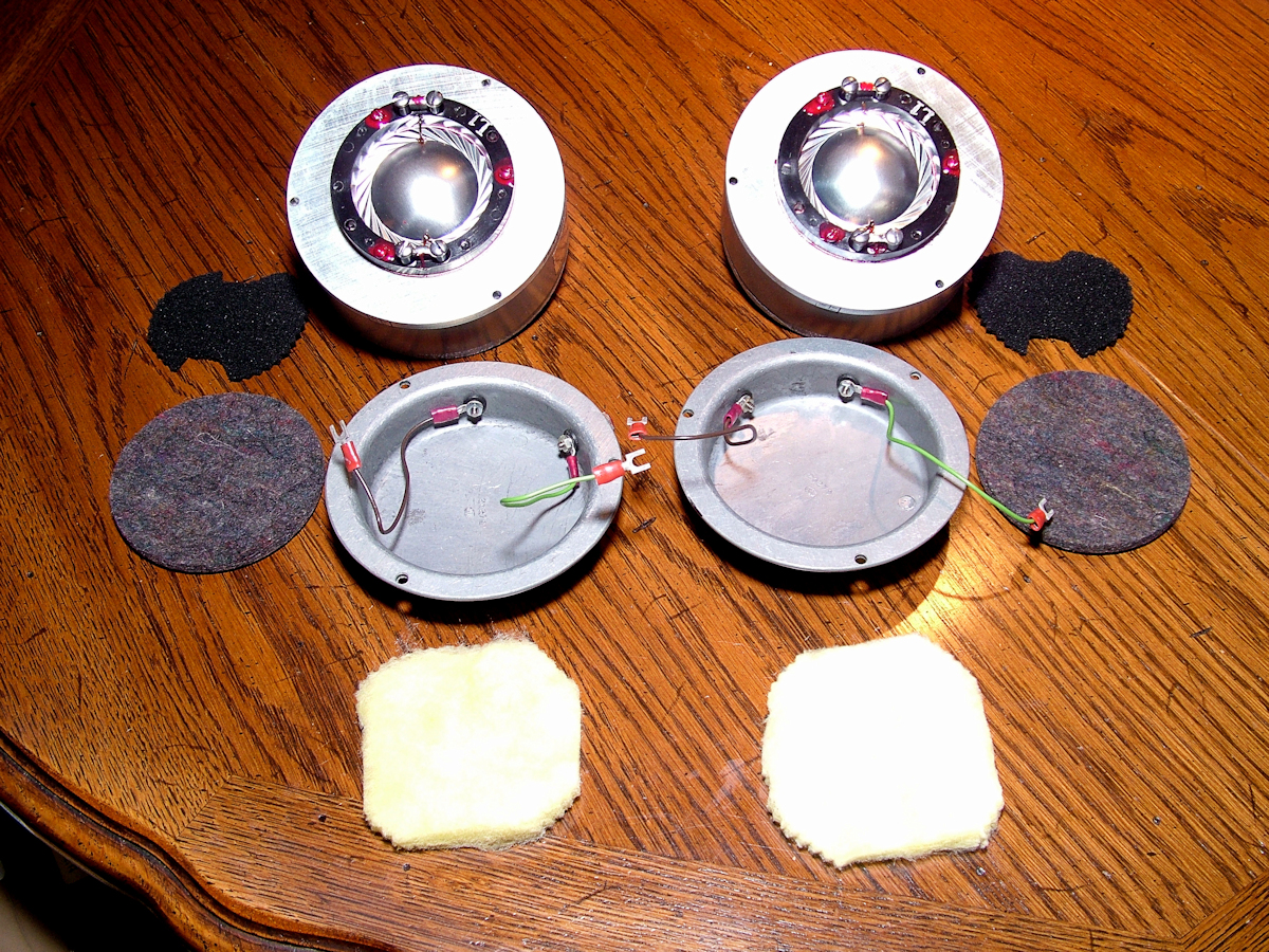 Altec, I had been told, recommended loading caps on its small format compression drivers which were crossed over at 500Hz or 800Hz to prevent diaphragm over-excursion at high output levels. I had also been told by another Altec home user that removing the cap would result in a sweeter and more natural sounding high frequency reproduction. The latter sounded very inviting to me, and, as I didn’t expect to run my A7s anywhere near theatre output levels, I removed the loading caps, re-secured the diaphragms with slightly shorter mounting screws and placed a thin layer of acoustically absorbent material inside the rear covers. It was good advice. The HF musical presentation was much more natural and relaxed sounding to my ears, and certain sounds, like brushes on cymbols, sounded fantastically accurate and real. That was over 20 years ago and I never used loading caps in home settings after that day.