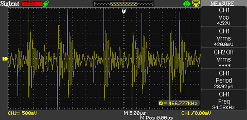 First the PS was plugged directly into the power strip and noise was noticed coming from the amplifier. Next a three pin to two pin adapter was used to lift the ground and also allow measurements at the ground pin. The scope probe was connected with the ground lead connected to the ground in one of the strip sockets and the probe tip connected to the ground output terminal on the 3 to 2 adapter. The scope was used in a single shot mode so that the trace could be loaded to a flash drive. Three measurements were taken as the noise was not constant and varied with time.