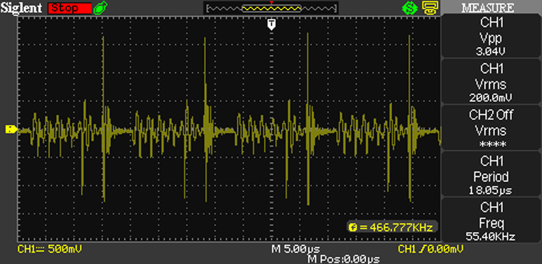 From the images, you can see there is a considerable noise with peak to peak levels reaching over 4 V and RMS values over 400 mv. There were also a wide range of frequencies with some of the highest peaks with a frequency of over 1 MHz. Nasty stuff. Once the cord is connected to the line ground some of this will be swamped out but apparently enough remains on the line considering normal line impedance to cause problems.