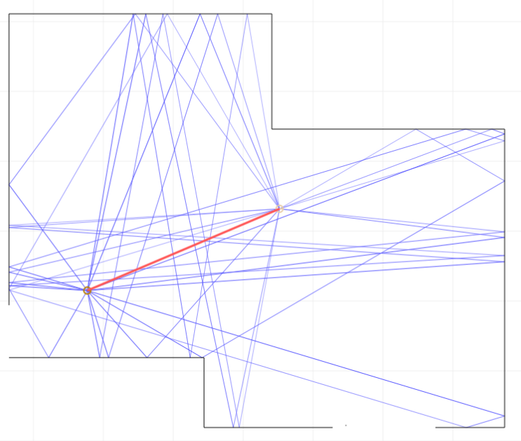 Pretty cool. The Amray tool is really fascinating, and if I'm reading it correctly it really helps visualize where the problem areas are. I did a quick sketch of my listening area placed a speakeri and a listener and here's what it showed. You can move either speaker or listenier around and the "rays" follow.