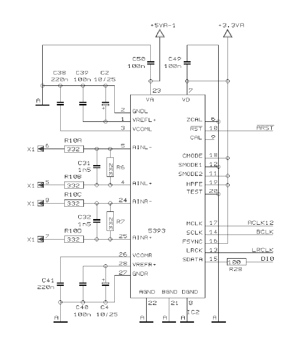 Here we see that the inputs of the ADC is feed from a network of 3 332 ohm resistors. As the signal applied to the network is balanced, each opamp will see one 332 ohm resistor and half of the resistor between the + and - inputs. Effective input load of the ADC as seen by the opamps is 332+(.5*332)=498 ohms. The load on IC8A and IC8B will be the 498 ohm load in parallel with the feedback networks. On IC8A the load would be 498 in parallel with R79 at 4.7K for a total load of 450 ohms. IC8B would see 498 in parallel with both R5 at 4.7K and R78 at 2.21K which comes out to 374 ohms. Pretty ugly loads for the opamps.
