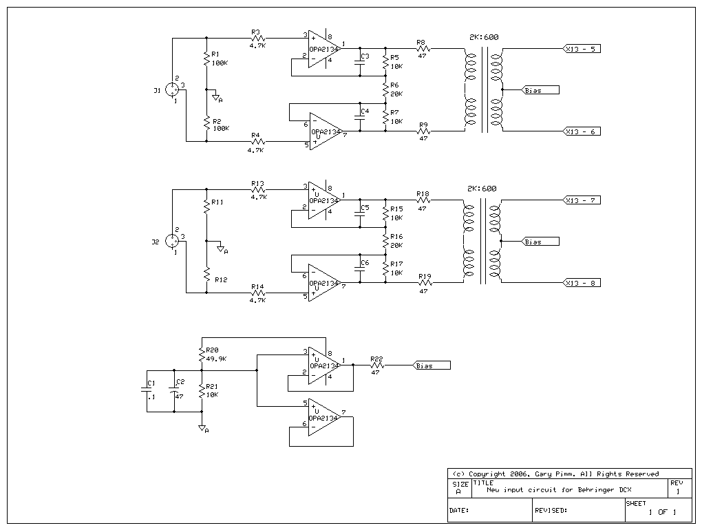 So, off to the web to try and find schematics for the Behringer DCX2496. Had good success, but I don't remember the site I downloaded the .pdf's from. Here is the analog inputs for channel 1 and 2: