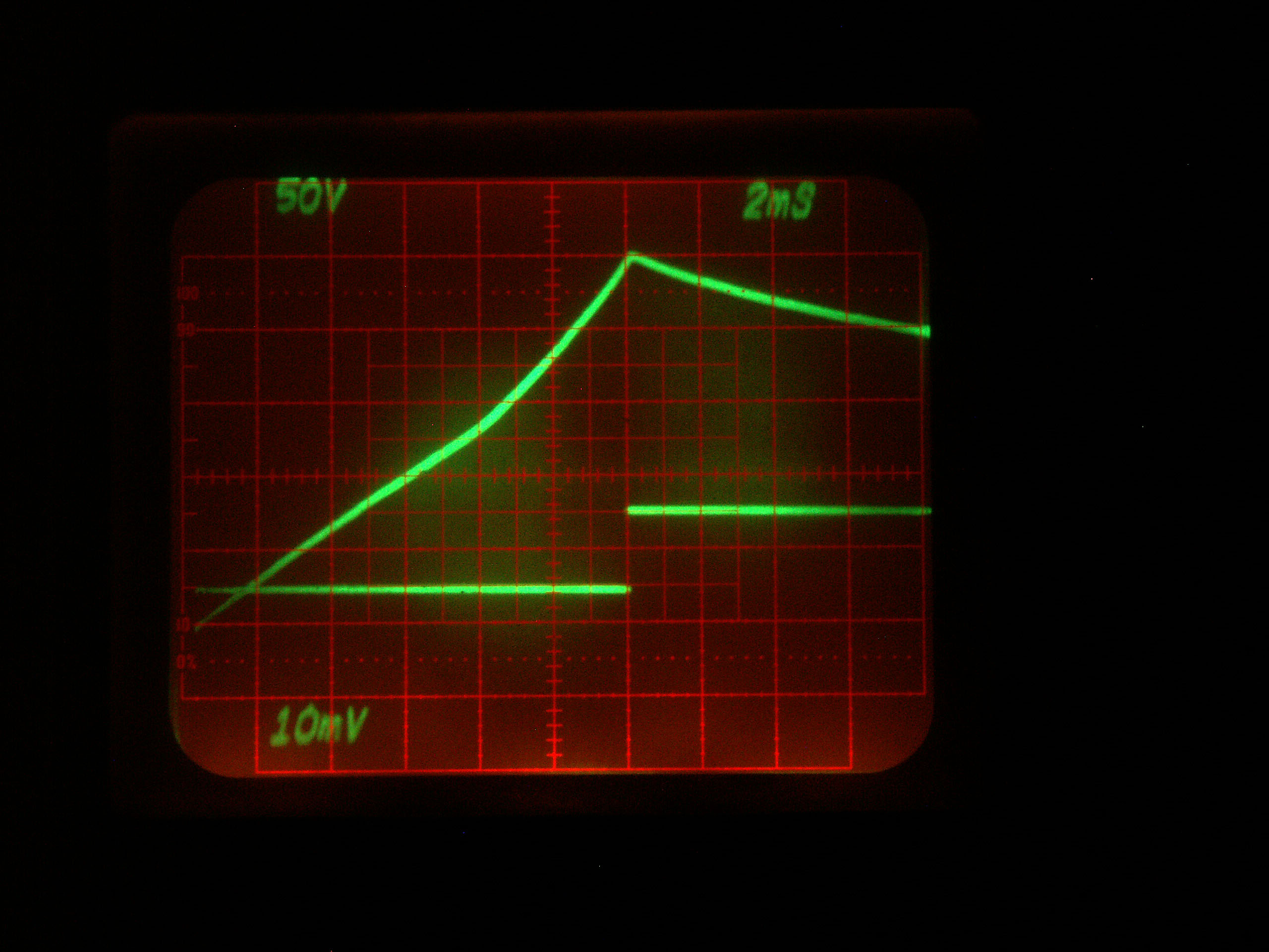 The power supply choke was 30 mH, 7A, .23 ohms DCR. The output chokes were 100 mH, 5A, .74 ohms DCR. Here are curves of the chokes from a curve tracer with a DC step signal.