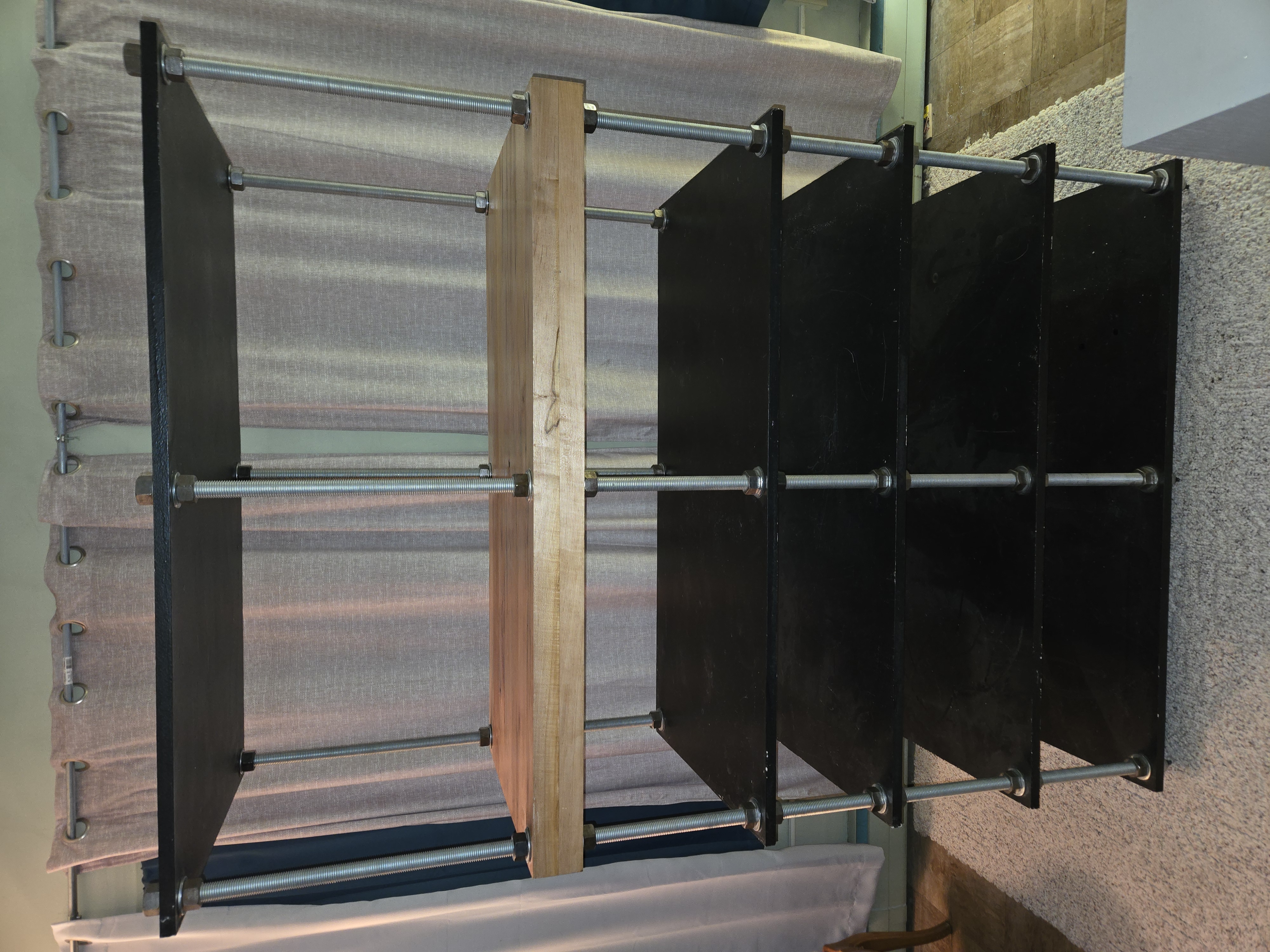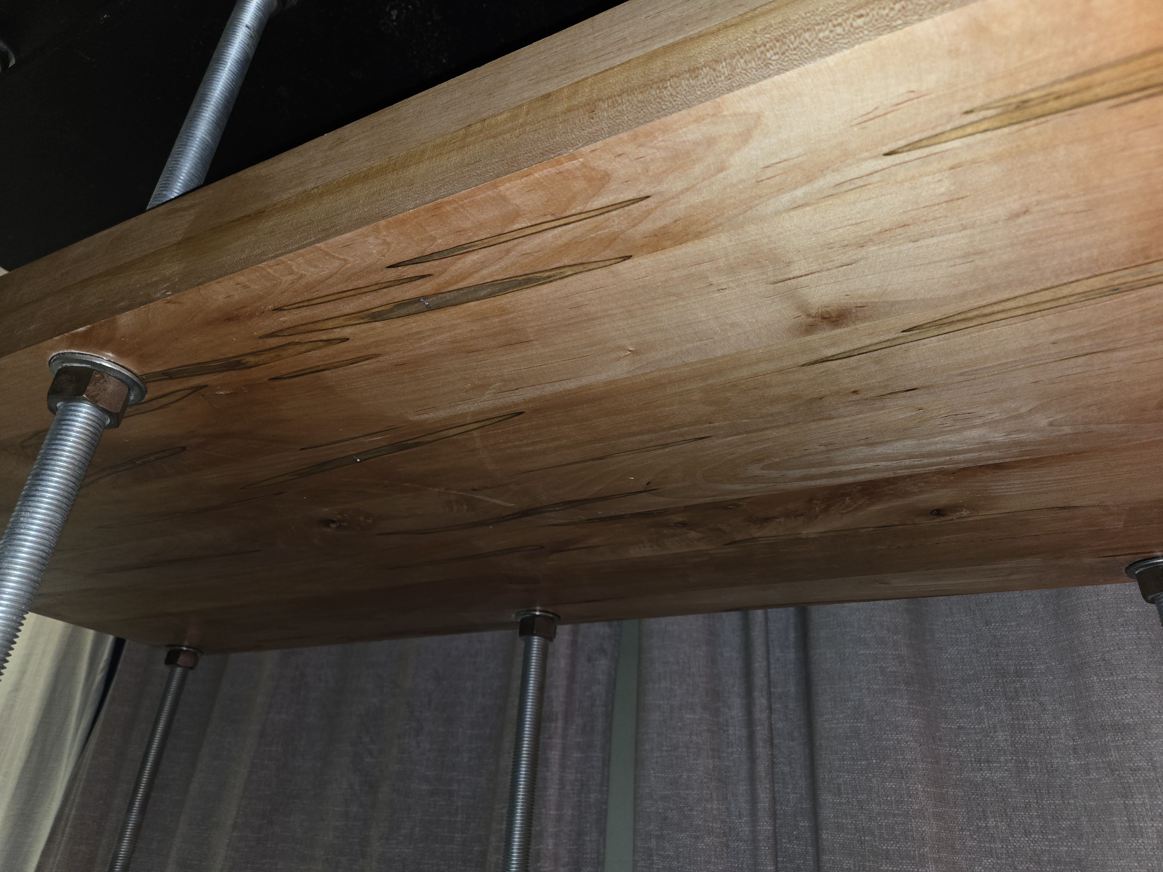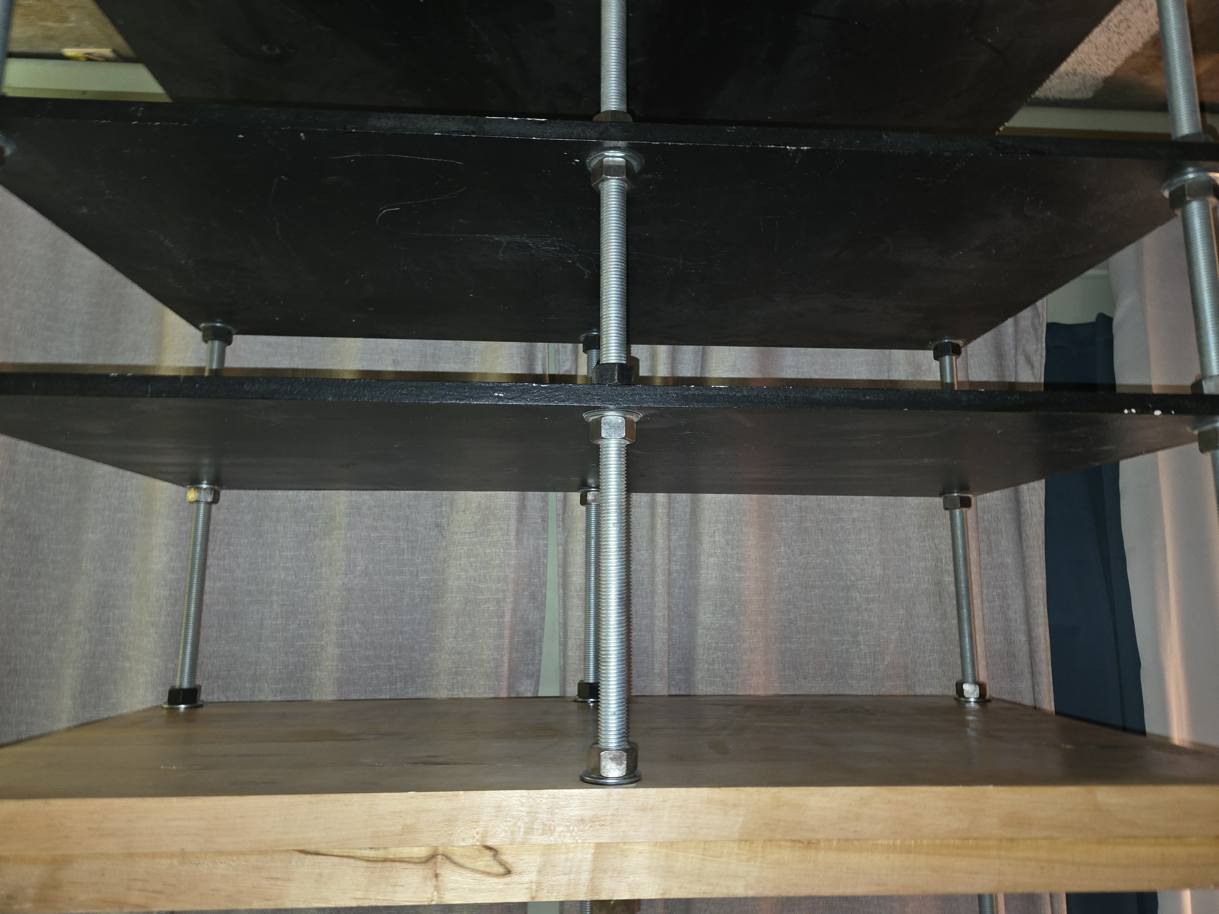 6' x 1" threaded rods. Nut/flat washer and rubber washer above and below each shelf.
