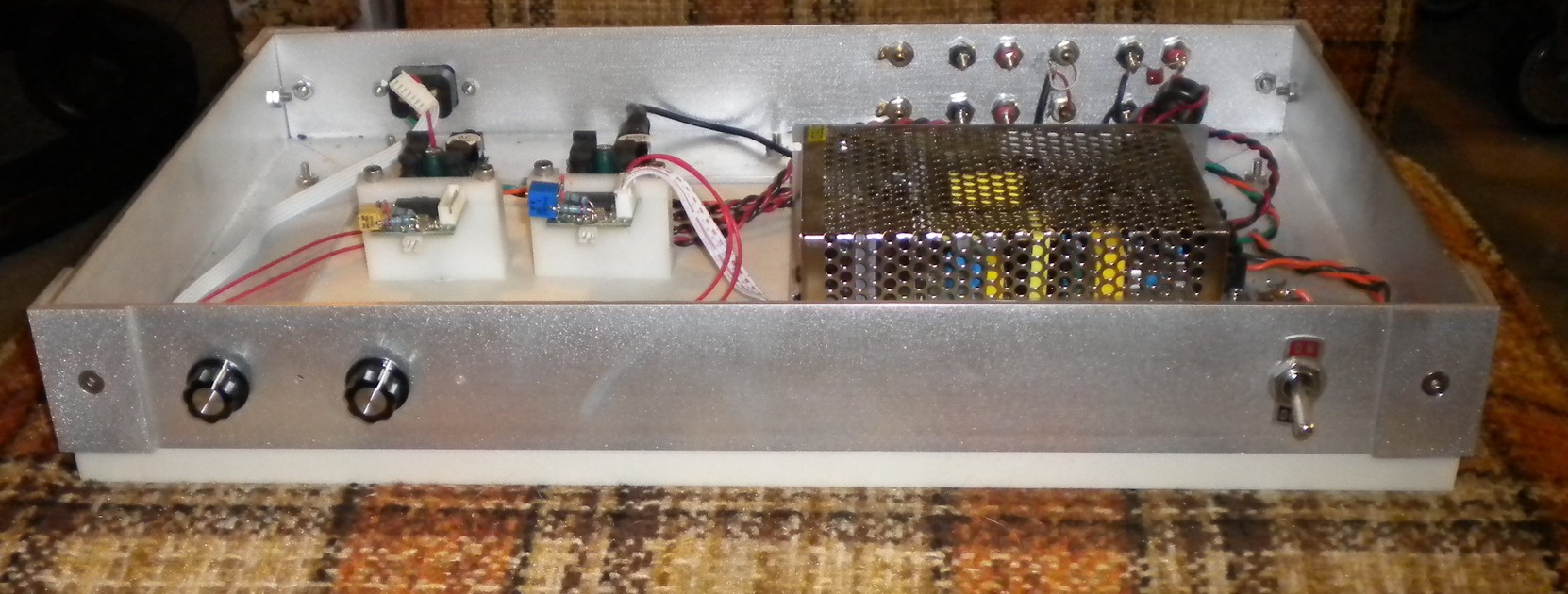 I make this when I though I was going to make a tri-amp system with horn mid-range and tweeters. It is two DTA-2 Class-T amplifier modules from Parts-Express with a packaged power supply. The DTA-2 modules are modified so you can set a pot and zero the DC offset. I though zero dc offset was needed if the amps were to directly drive horns. I hooked up and tested on of the modules into a dummy load and it worked fine. Pictures below -