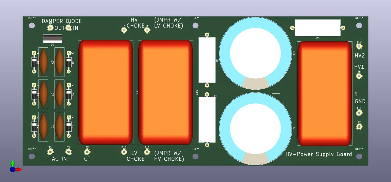 The boards are still being refined. I caught an error in the direction of rectifier diodes in the bridge on the Driver Board (quickly corrected), but based on some feedback from Charlie, I reworked the HV Power Supply board rearranging the rectifier and adding another filter stage. This will work better as a generic power supply board, basically a higher voltage equivalent to the Driver Power Supply board which is similarly a CLCRC arrangement.