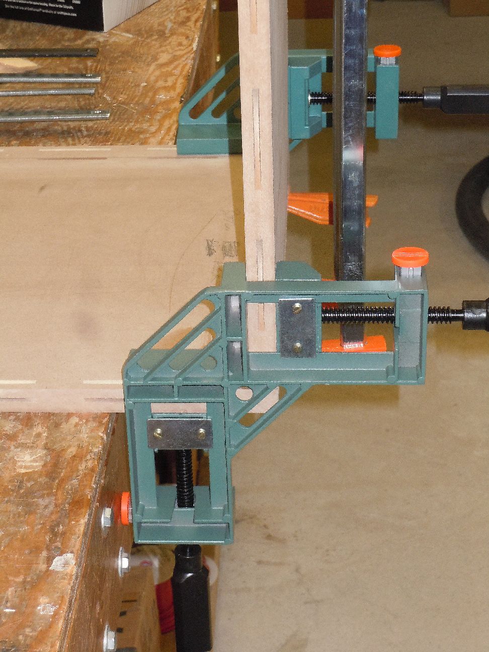 If anyone would like to try biscuits I have a Porter Cable plate joiner they can borrow. I have also fashioned a hose connection from it's exhaust port to a standard shop vac hose. As Jeff said the dust is a problem and all of my tools have vacuum connections to my shop vac. That even extends to my sander. I'm enclosing a photo of two MDF pieces that have had slots cut into them and are being glued while being positioned with corner clamps and a PDF file of some of the adjustments of the plate joiner.