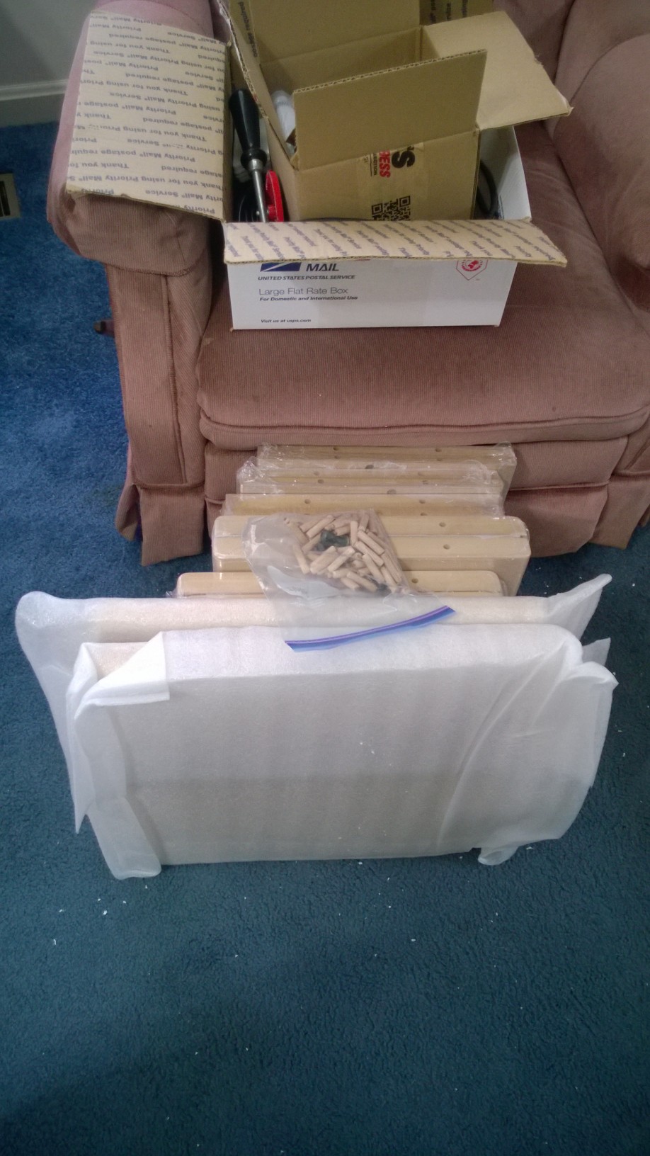 Second flatpack box unpacked and getting ready for some glue-up and clamps. Was stored in the garage, so letting it warm up to room temperature first.