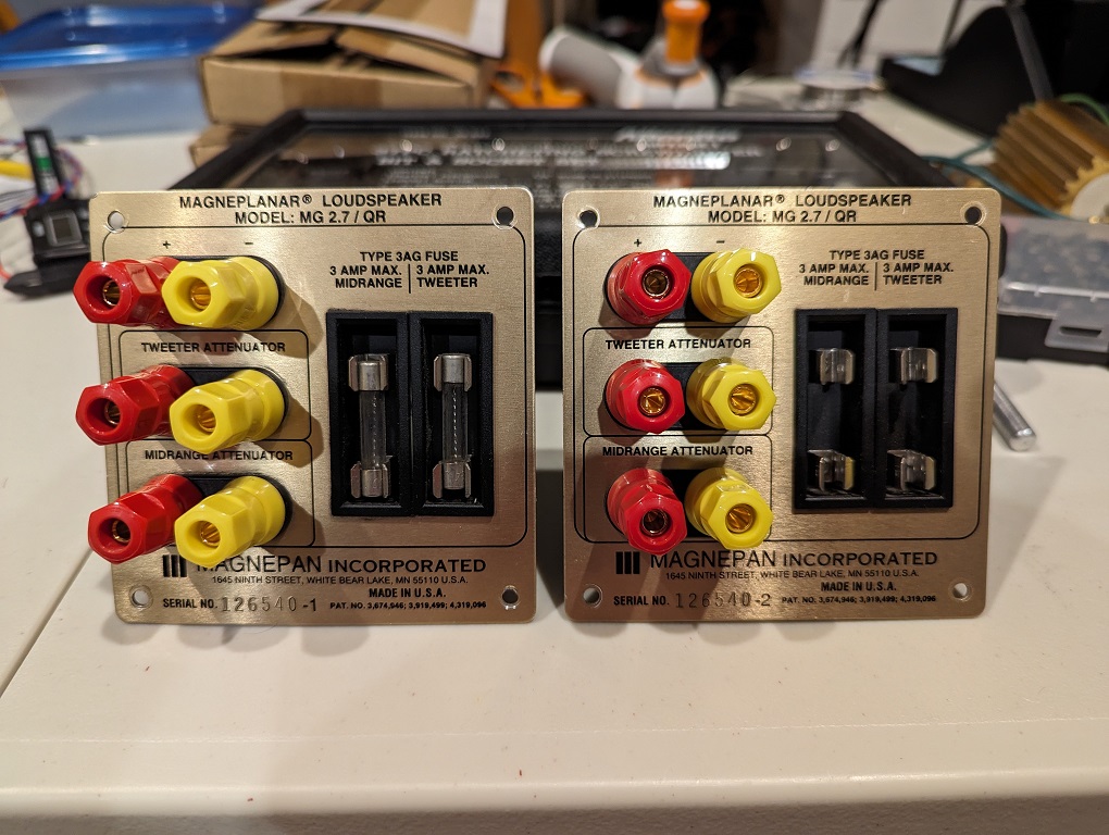 Talked to Magnepan and was able to get a pair of used 2.7/QR speaker connector plates to rewire the 3-way 1.7 planar speakers for direct amp drive. I can also rewire the fuses to the tweeter and super tweeter for protection.