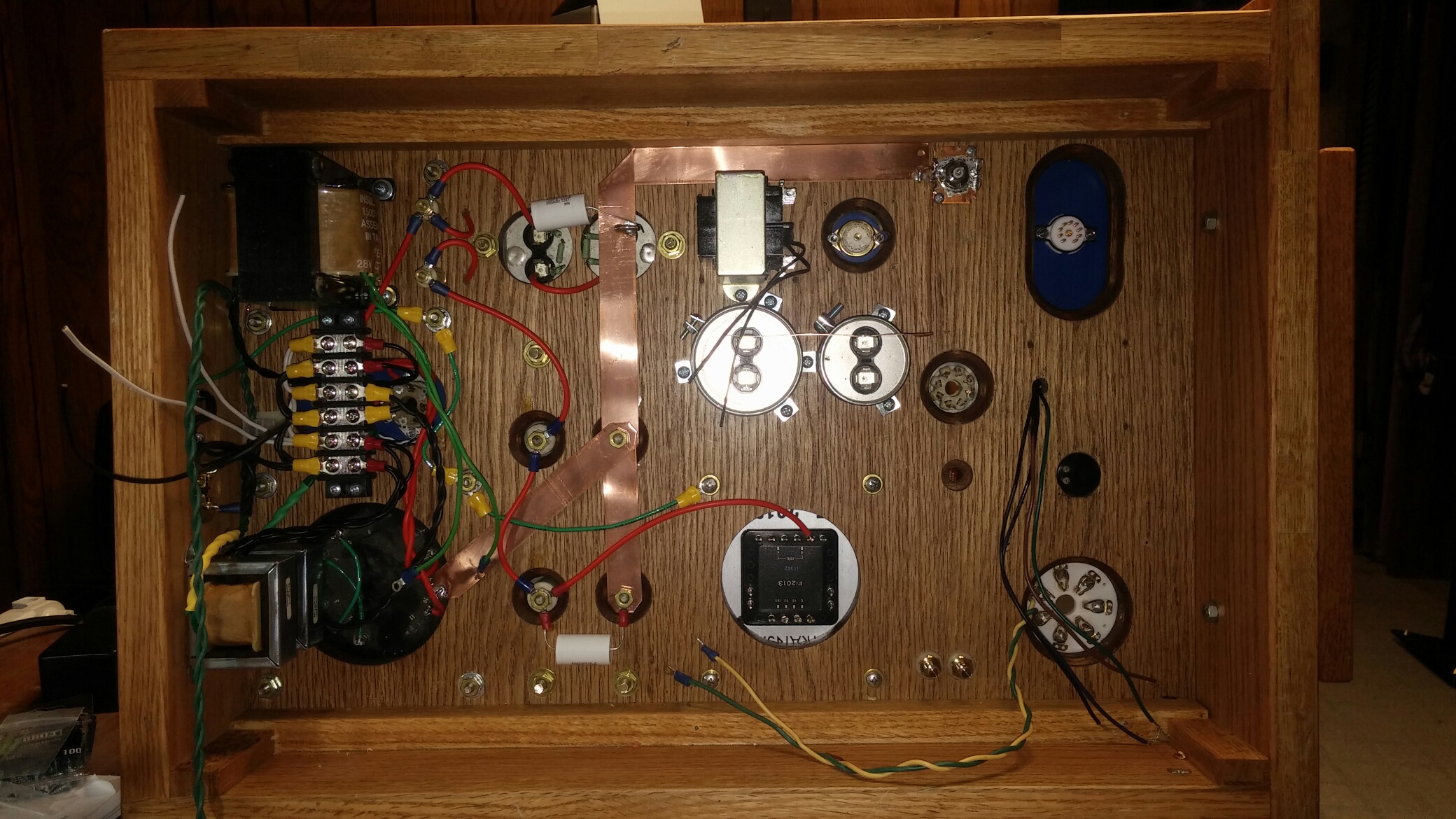 Another progress report. Wanted to show the copper ground buss for the power supply, since that is hidden from view when the amp is fully assembled. Using 22 or 24 gauge (don't remember offhand) copper sheet, cut down to 1" wide strips running from the HV power transformer to the capacitor terminals, and finally to the input jack. Using bronze external tooth lock washers between the terminal and each buss layer to ensure a good mechanical/electrical connection when the terminal nut is torqued down.