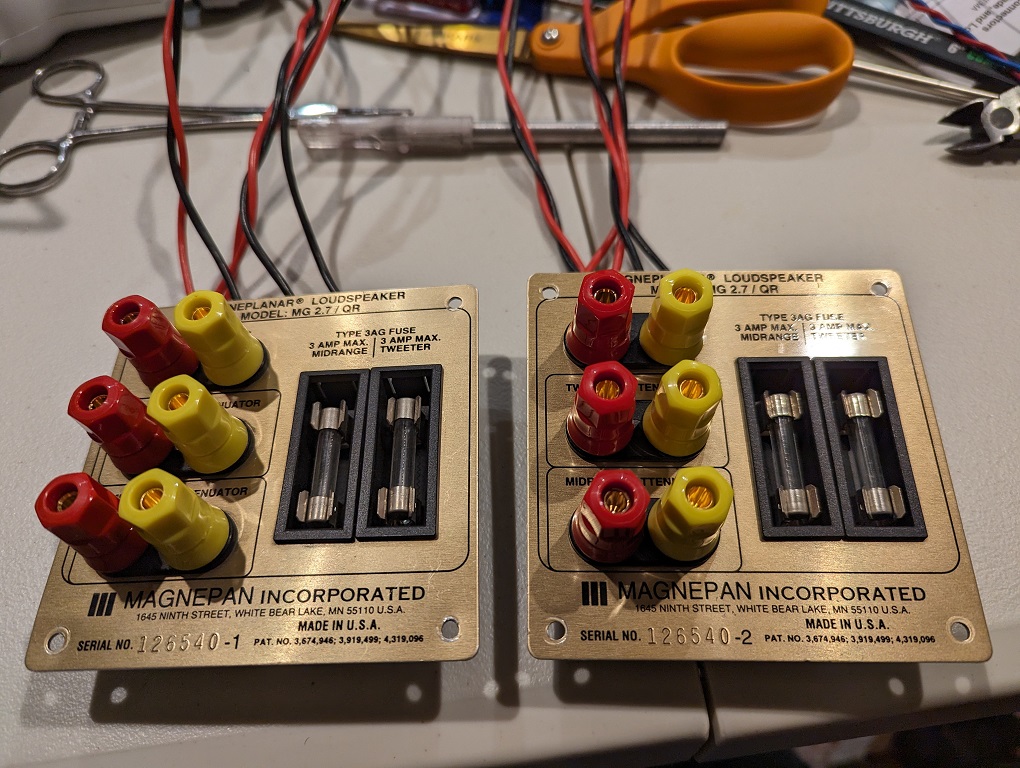 New connector plates wired for 3-way use for the Magnepan 1.7 speakers.
