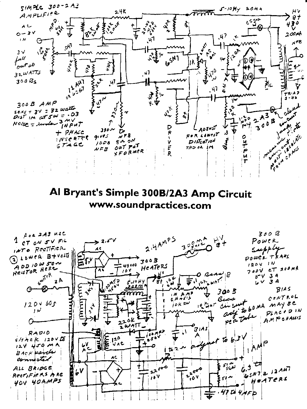 I figured out what tubes I could add where, then hunted around for a circuit that might be fun. In my stash I came across that old PP 300B circuit from Sound Practices, by Al Bryant, "Homebrewer of the Month," who built his amps on cake pans (anyone remember that?). It was a perfect match for the chassis. I don't know of anyone ever actually building it, that I heard of. So here we go: