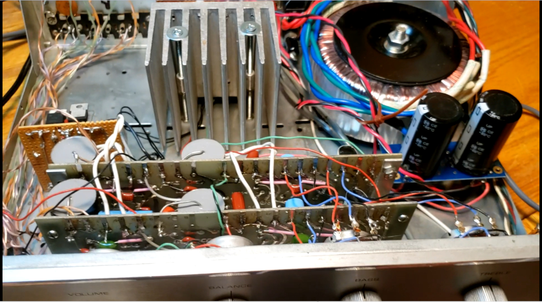 Digging into it, the power amp was dead, phono and line sections, as well as power supply were okay. So, I pulled out the power transformer and power amp. This build had to be all off-the-shelf. The perfect toroid was on the shelf, along with an LM4780, board, heat sink and power supply board; so in they went. The input and phono stages needed 17.5 and 24 volts, so a couple of LM317s on perf board fixed that. I replaced all caps and resistors on the phono/line boards, eliminating electrolytics where possible and where they had to remain, they became Silmics or similar. As you may know from a previous post, I broke the selector switch in the process of the build. The replacement was a 2-pole 5 position switch. Since the unused inputs could no longer be shunted to ground, the input wiring had to be re-done with individual twisted pairs (Teflon insulated copper, woo-hoo). Also, the phono equalization had to be hard wired to the board. The "Special" input became a line-level input, since we have zero need for two phono inputs in the amp.