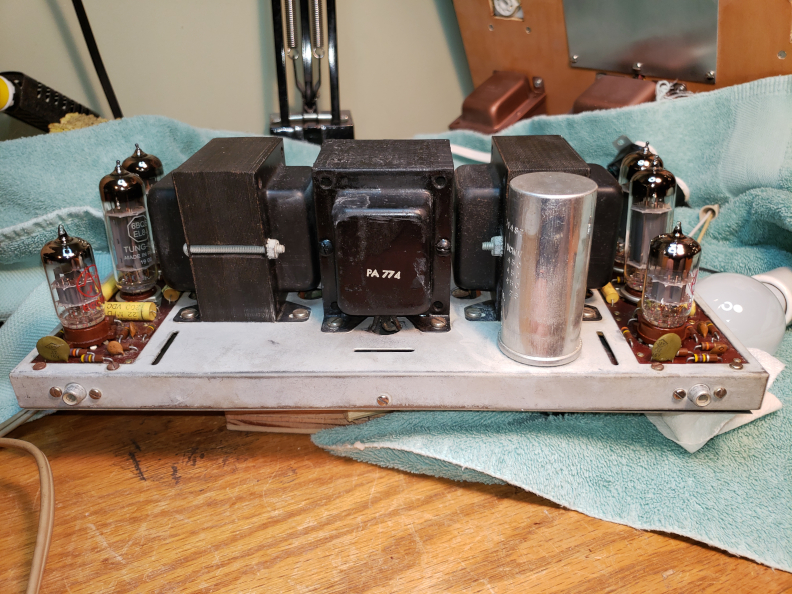 As to the PAS-3 and ST35, after cleaning them up and a visual inspection, each, individually was turned on with an incandescent lamp in series, starting with 25 watts, working up to 100. Left each in position for at least 6 hours, and a couple over a day. The PAS had it's original Telefunkens and 12X4, they tested excellent, so they remained. The ST35 had broken 7247s and nasty looking outputs, so JJ Tesla ECC823s went into the input and a matched quad of Tung Sol EL84s went into the outputs.