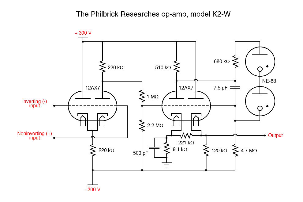 Still, unless the inputs are cap coupled to the preceding stage, the +/- grid inputs need to be at 0VDC. The cathode will be at a slightly positive voltage, with the 220K resistor to the -300V supply (resulting in 1.33mA current draw for both sections). So, in the first section, the plate for the - input is tied directly to +300V plate supply, and the + input has a 220K plate resistor. Lets assume that the grids tied together is an error, since the cathodes ARE tied together. So how does the circuit work from a DC perspective and keep the inputs at 0V? My first thought was that the schematic is in error. The circuit would be in DC balance IF there is a similar 220K plate resistor for the (-) input side, which means that both sections would have 150V drop through the plate resistors, 150V across the tube, the input grids at 0V. Both sections would have the same operating point (given matched sections). However, I did check with other schematics online, and am chastised that the schematic you posted IS correct for the Philbrick K2-W. I am stumped on what is going on.