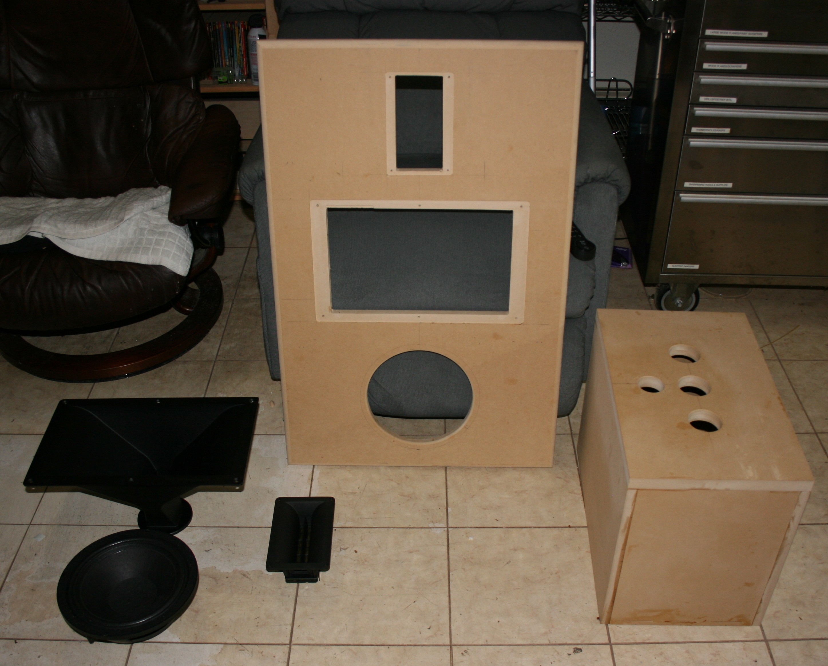 So, these "crossover" elements will be mounted inside the cabinets, the woofers wired in parallel internally, the cabinets stuffed a little less, the foam removed from the front of the cabinets, since the diffraction from the edges of it were very obvious and annoying (the opposite of what I thought might happen and the whole reason I put it there). Also, the tweeters will be recessed about 1/2" into the cabinets. They have been mounted on an 1/8" plate on the surface of the cabinets. This because I originally used a different tweeter with a larger cutout. Gonna make inserts and "flush" the face of the tweeters. Hopefully a bit better time alignment.