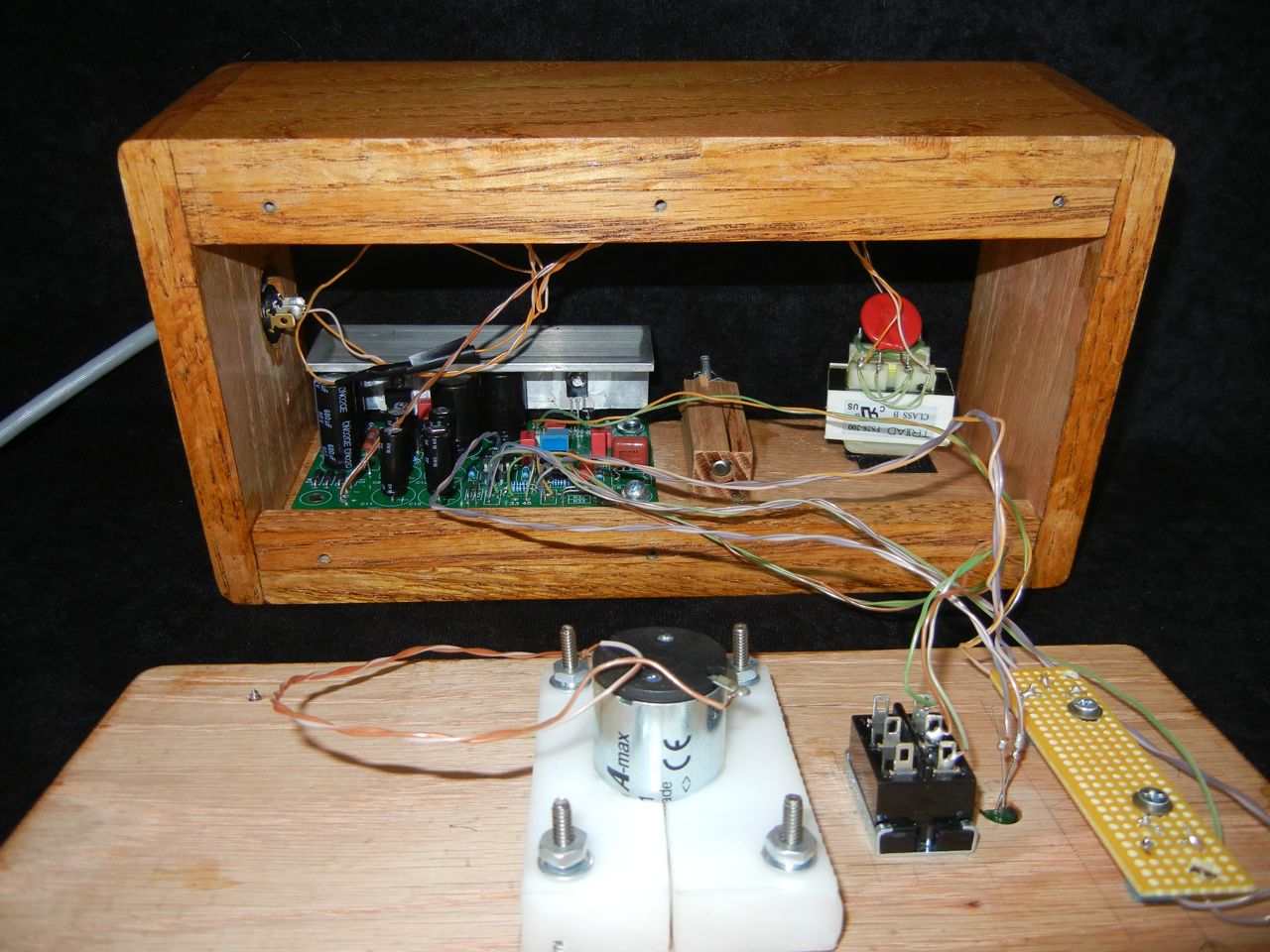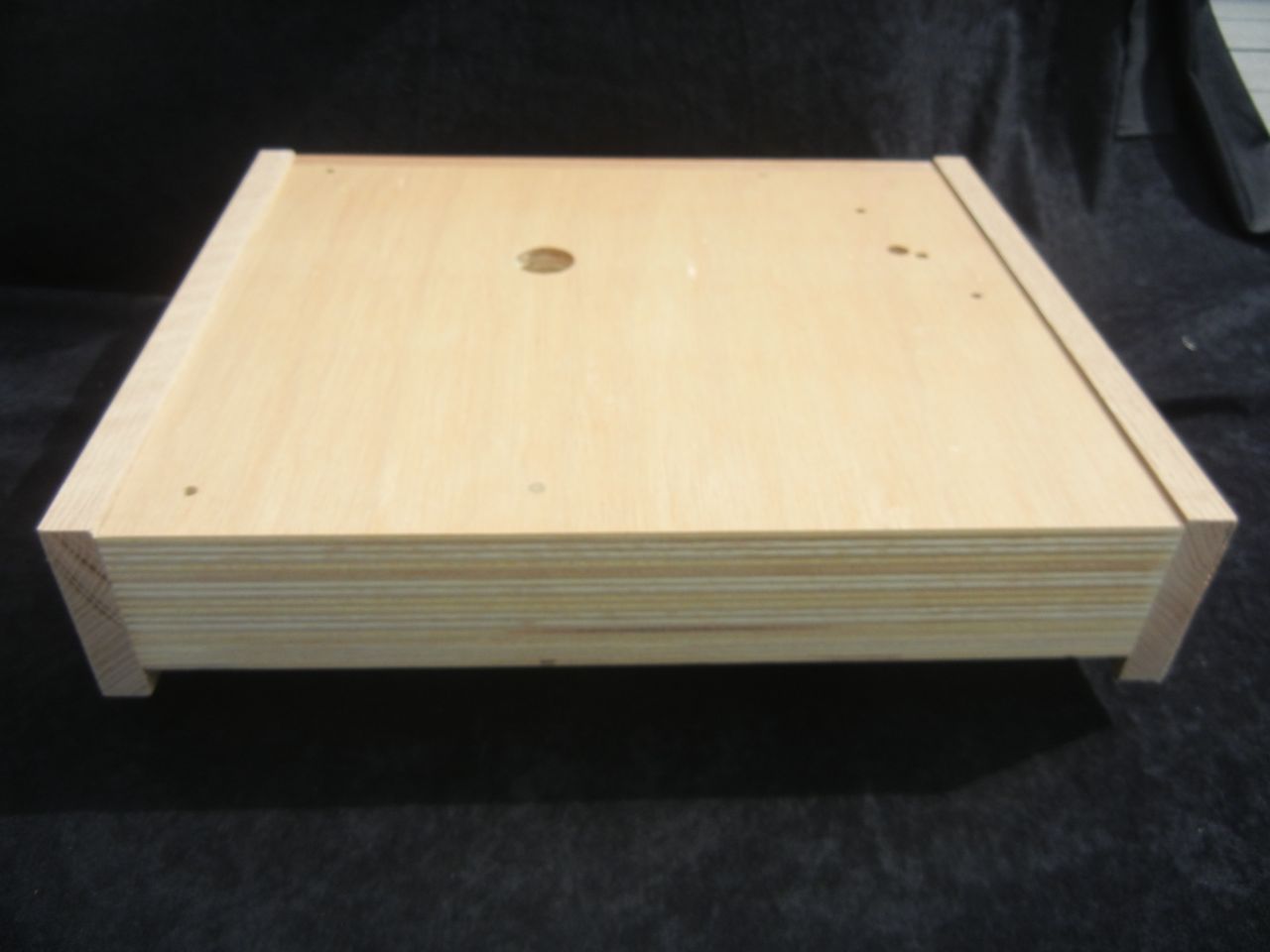 After struggling to choose a direction, I realized I had to start somewhere that might not have the optimal solutio, but would give me a starting point for future comparisons. I decided to make the plinth out of layers of birch-veneered plywood. A suspension system was too complicated to consider, so I skipped it and hoped that I could isolate the turntable in other ways. The platter was designed for belt drive around its perimeter, and John Parker said, “If you mount the motor and drive pulley very close to the platter, then you will need to consider the reduced wrap angle of the belting material and the reduced surface area that can be used to retain tension on the belting material. This could cause very irregular speed control because of slippage.” For this reason, the motor was mounted in its own box separate from the plinth.