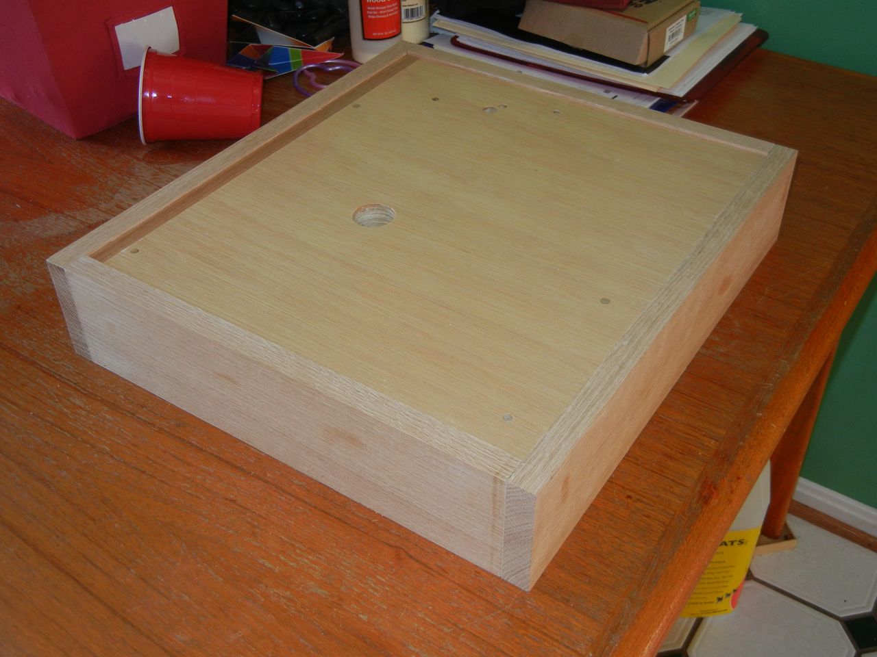 I laid out the two top pieces carefully using the factory edges for reference and marked the bearing hole 5¾” from the back and 6¼“ from the left as laid out in Figure 6. I drilled the two holes separately on a drill press because it’s easier to drill thinner pieces then thicker – the bits get very hot when you drill thick stuff. I used a 1¼” hole saw because I didn’t have a Forstner bit that big, and, in my experience, a spade bit usually makes a horribly rough hole – good for rough carpentry but not for cabinetwork.