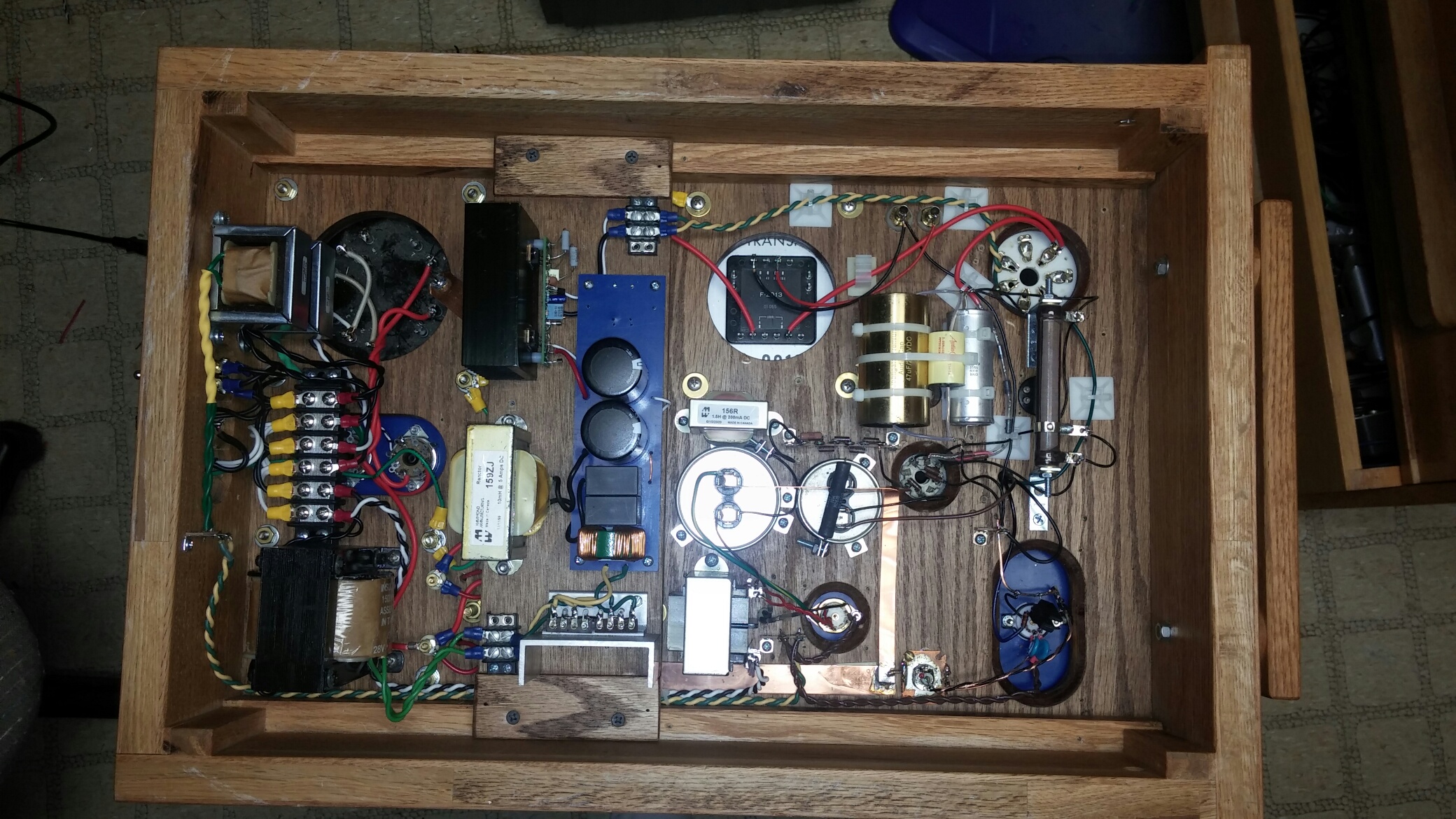The B+ power transformer is dead cold when operating. It is a big UTC 1500VCT/1900VCT/300mA continuous duty unit that Grover donated, and after running a half hour or so, is still cool to the touch. Also using a big 10H/500mA choke, another Grover donation. The big oil capacitors are 88uF/1200V pulse capacitors (either paper/oil or PP/oil).