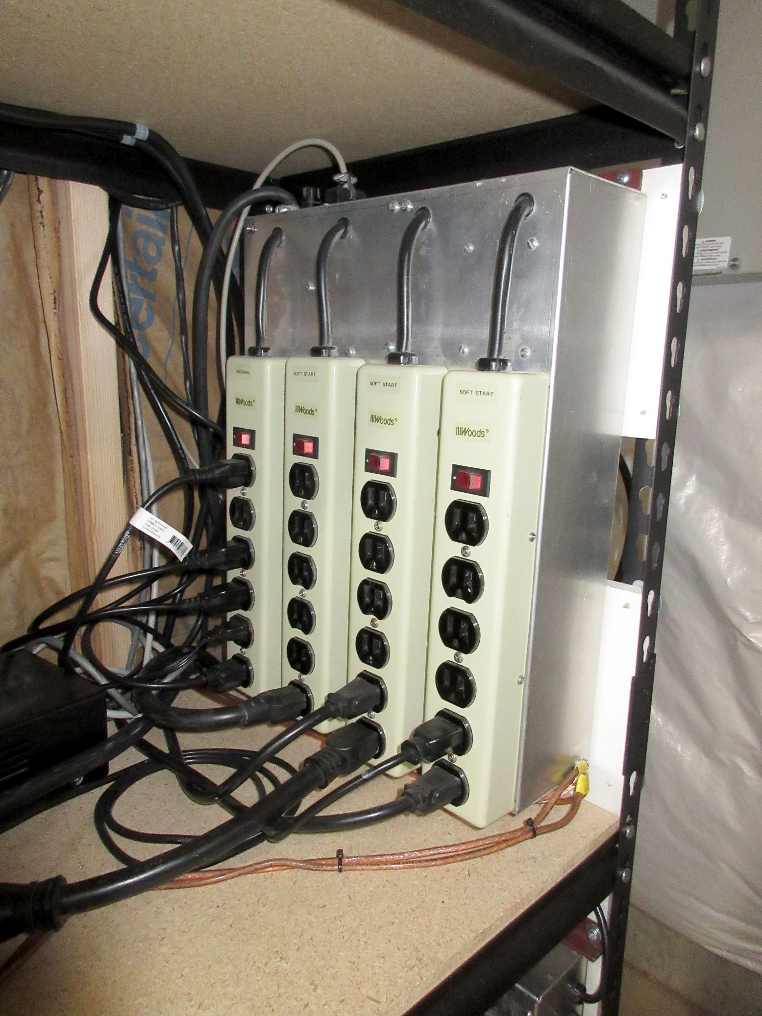 In the current house, I'm running everything including over 7KW of amplifier power since I have added the distributed subs to the system powered by a Crown Studio Reference amp for a quad amped set up. It is on a dedicated 30 amp circuit and still goes through the soft start circuit. I'm including a photo of the equipment rack in the basement and the soft start circuit panel. It also has one power strip that is a straight on/off because some digital displays do not like a soft start. I'm including photos on the rack and soft start.