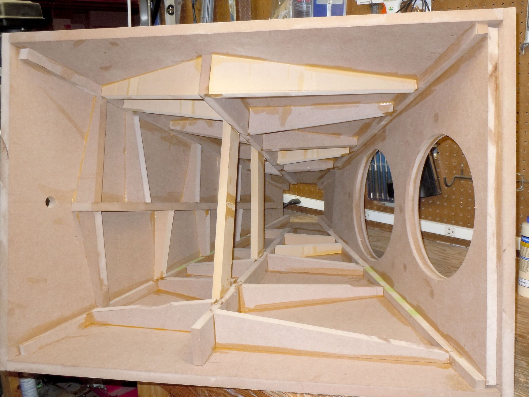 The Occasional Podcast had an interesting discussion with speaker designer Andrew Jones on speaker enclosures. I especially appreciated his mention of eliminating panel resonances by choosing sizes that would resonate at frequencies that were not in the range being produced by the drivers used. I have used this in many of the speakers I have built with great success. I'm including a photo of the inside of my truncated pyramid bases for my current speakers showing how random placement of braces breaks the panels up into many different sized sections, none of which resonate at the frequencies produced by the woofers.