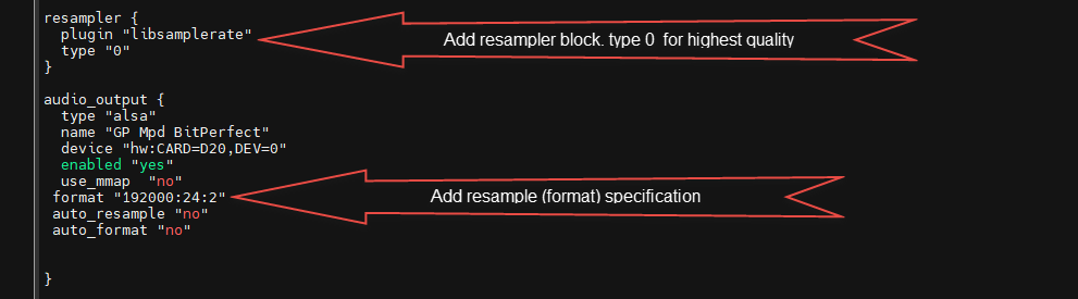 For anyone who wants to try out the libsamplerate resampler, make the following changes in /etc/mpd.conf and bounce it. I doubt it will work with low-end CPUs like atoms and celerons.