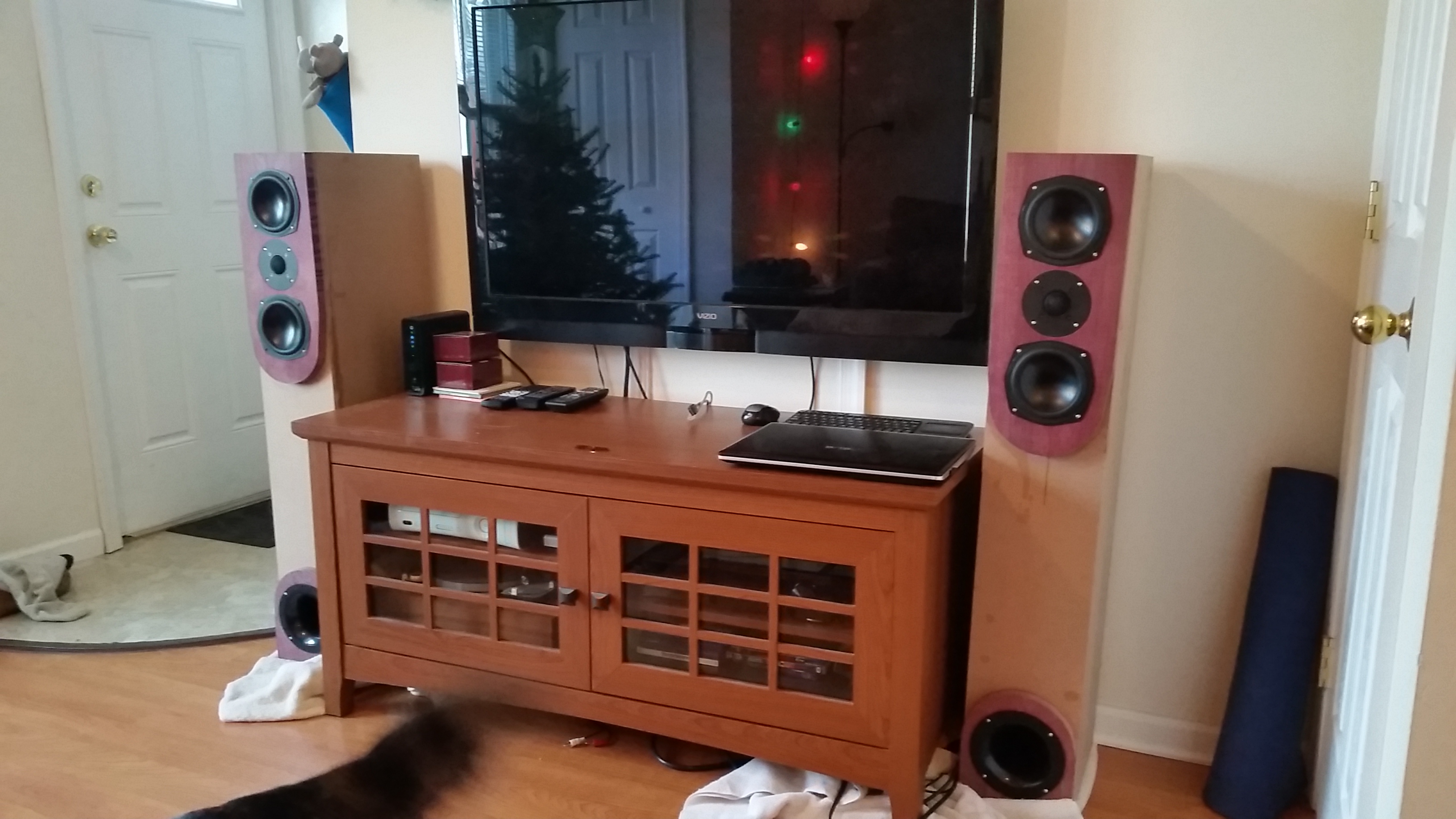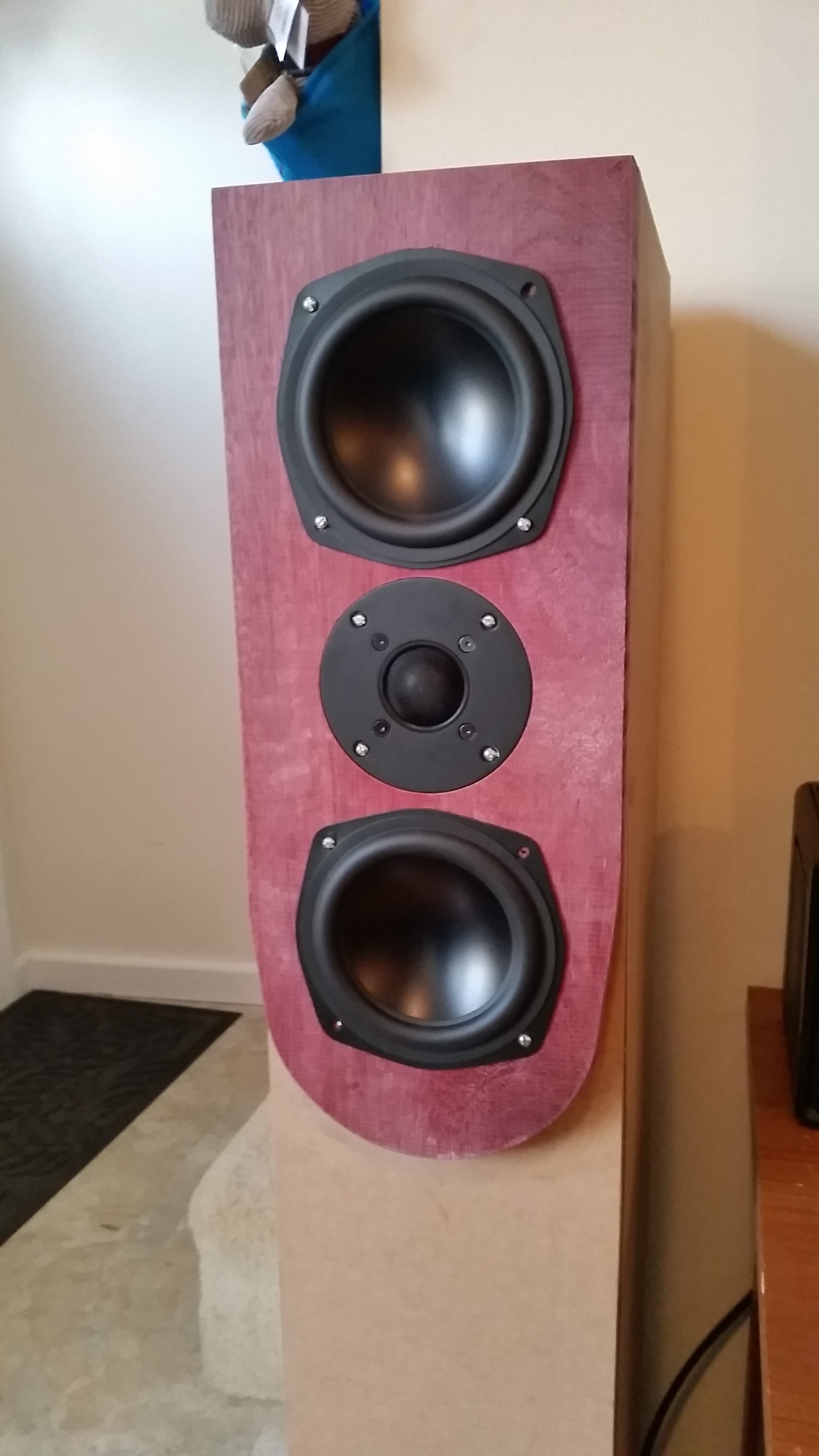 Finally listening to them! So excited. They were are a bit tubby in the 80–150 Hz range until I added some more Acousta-Stuf and got the MLTL dampened adequately, and I'm using some EQ (iTunes, the pinnacle of frequency response massaging—I know) to bring it down a bit more. What I've learned after some forum reading is the flatulence is somewhat expected since the port in addition to the TL supplement the lower registers of the active drivers, not the port or TL solely. I pulled the towers out from the wall about a foot and tried toeing them in about 15° which has helped a bit. I also need to add a stand or some feet to raise the tweeter about an inch or two to bring it up to ear level when I'm sitting, so maybe that'll attenuate some boundary loading from the floor as well.