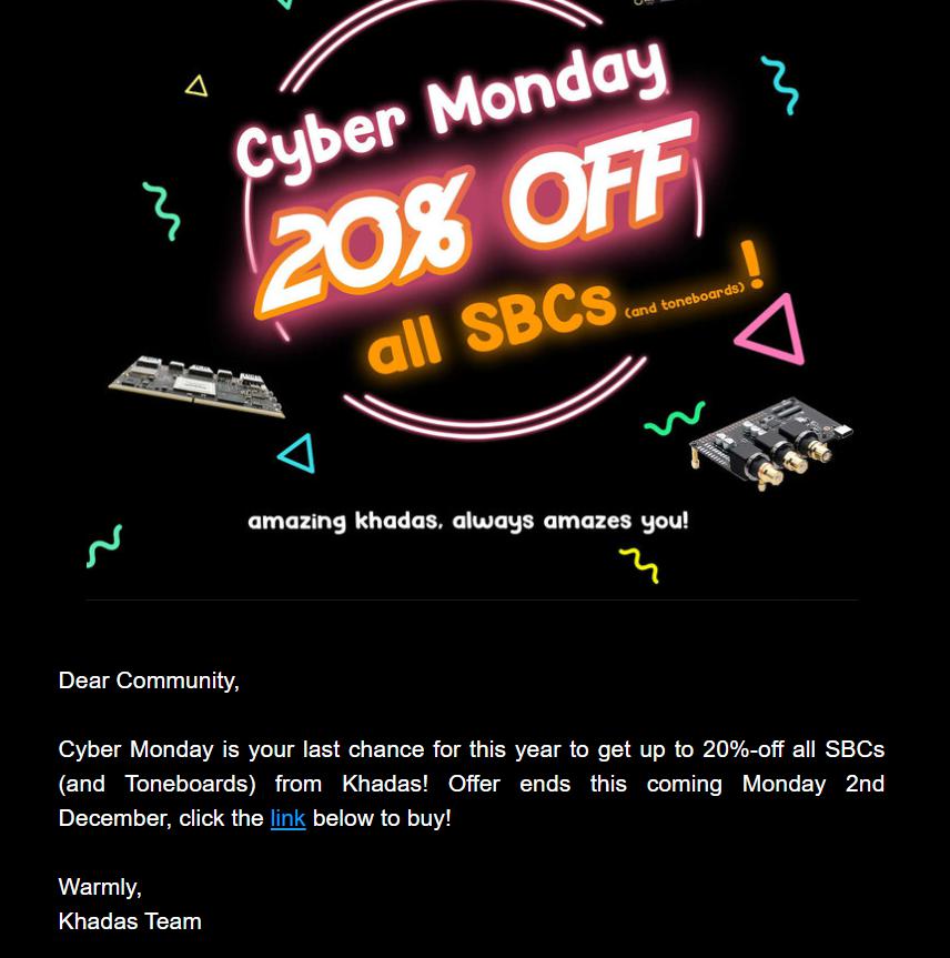 I received a note that the Khadas tone board is 20% off on Cyber Monday. There was a link that brought me to Amazon but the price today is the regular price. You probably have to check on Monday.