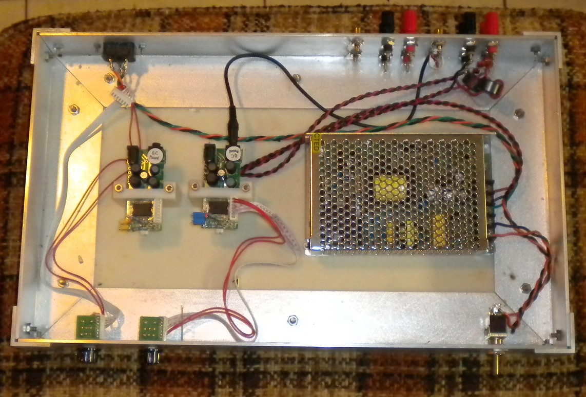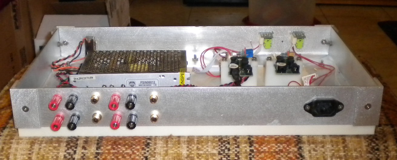 I make this when I though I was going to make a tri-amp system with horn mid-range and tweeters. It is two DTA-2 Class-T amplifier modules from Parts-Express with a packaged power supply. The DTA-2 modules are modified so you can set a pot and zero the DC offset. I though zero dc offset was needed if the amps were to directly drive horns. I hooked up and tested on of the modules into a dummy load and it worked fine. Pictures below -