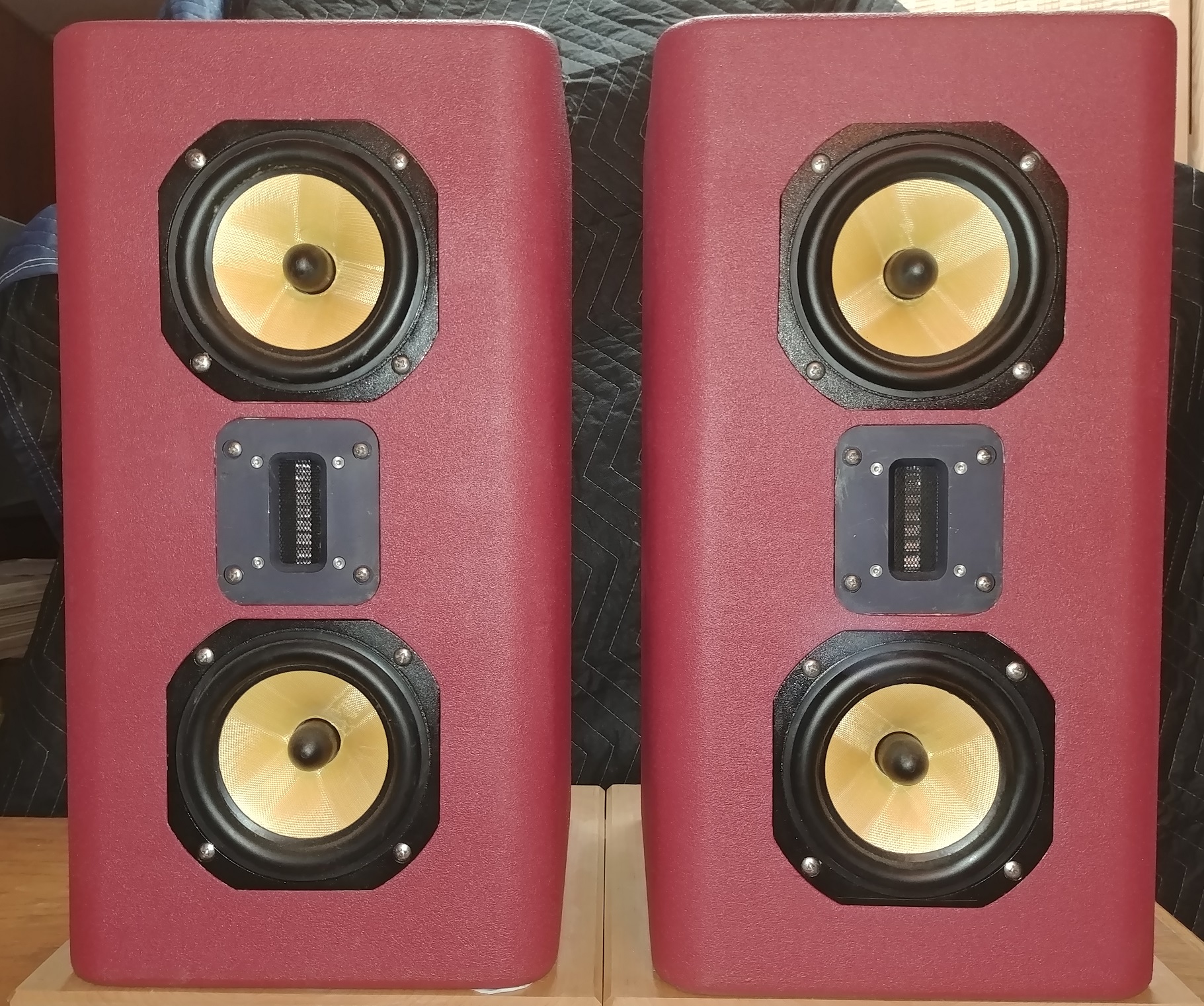 This is a relisting of my Aria 5R speakers which I have been using up until this week. They are a D'Appolito array using a pair of Focal 5" Kevlar bass-mids and a Raven R1 ribbon tweeter. The cabinets are very robust (1-1/2" thick MDF), and I have heavy stands for them. They are 95dB/1W, 4 ohm speakers, and prefer a good Class A solid state amplifier over a tube amp. I found they worked great with my Moskido amp. They extend down to around 60 Hz, so should use a subwoofer for a fullrange setup.