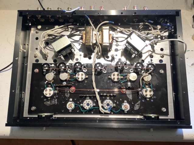 So a few years ago my friend Jim bought a used Sofia Electric PP EL34 amp, only to learn after receiving it that the previous owner had "modified" it for 6L6's. Whatever he did, the thing never worked and kept blowing tubes and fuses. Jim took it over to Richard at Sofia to see if he could "fix" it, but Richard said it was such a mess he couldn't do anything. It sat in a closet for a few years, then when Jim and his partner retired and moved to Lewis, he sent it to me to see if I could do anything with it.
